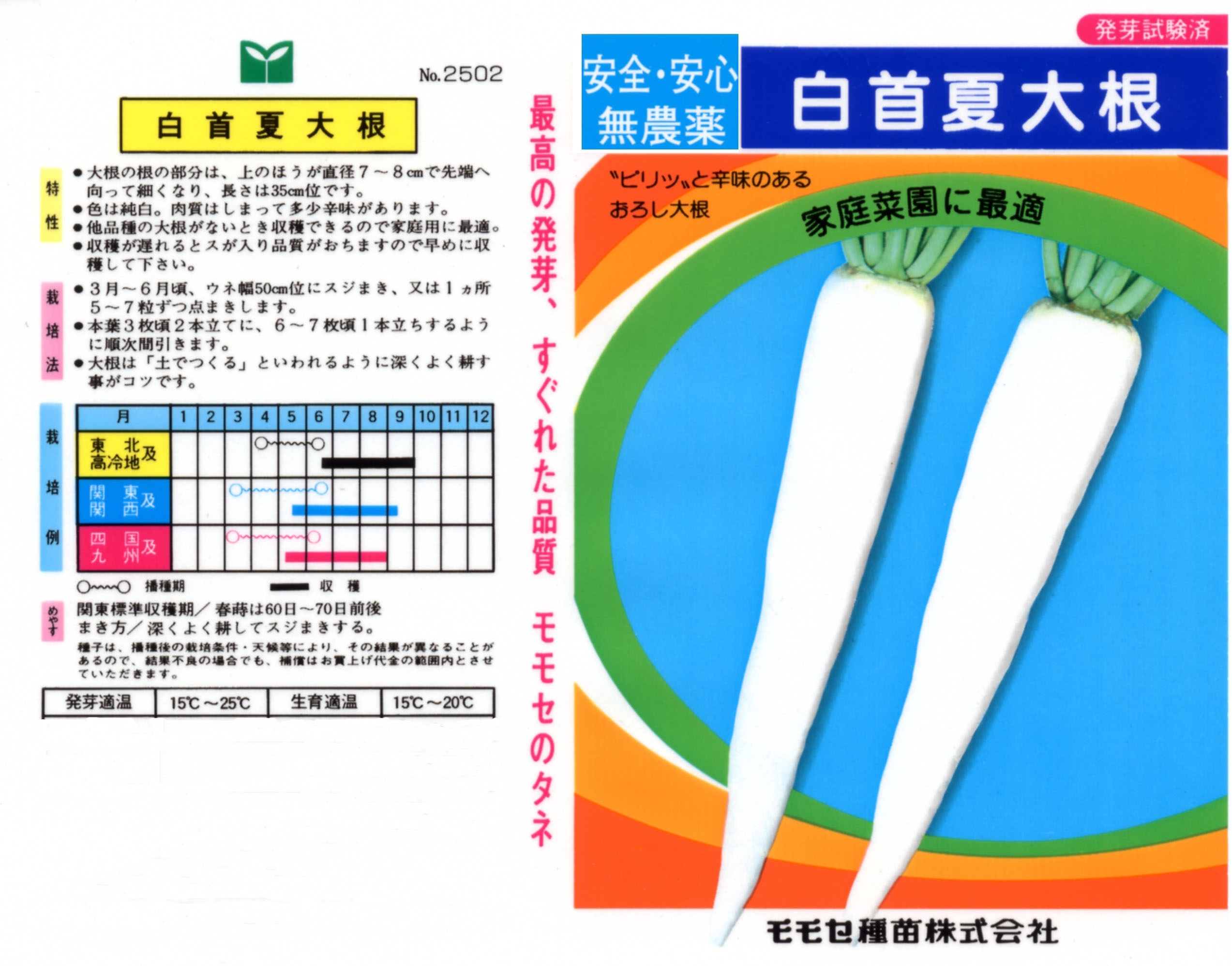 本種は、春まき夏収穫の大根の優良種です。暑さに強くトウが立ちにくく、根が比較的短い品種です。肉質はしまっていてやや辛みがあります。大根おろしが辛みがきいて美味しいです。もちろん煮食にも適しています。