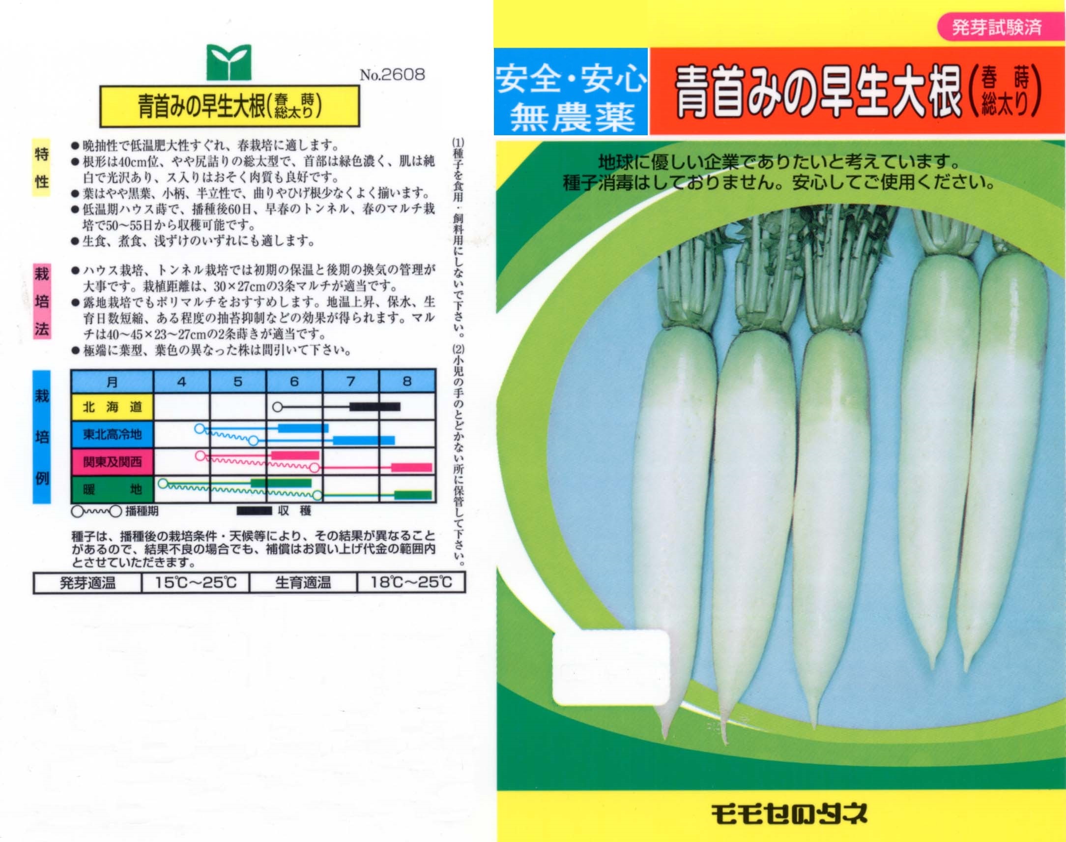 本種は、病気と暑さに強く、生育の早い大根です。春まき初夏~夏収穫の栽培ができ、大根の少なくなる時期に重宝します。