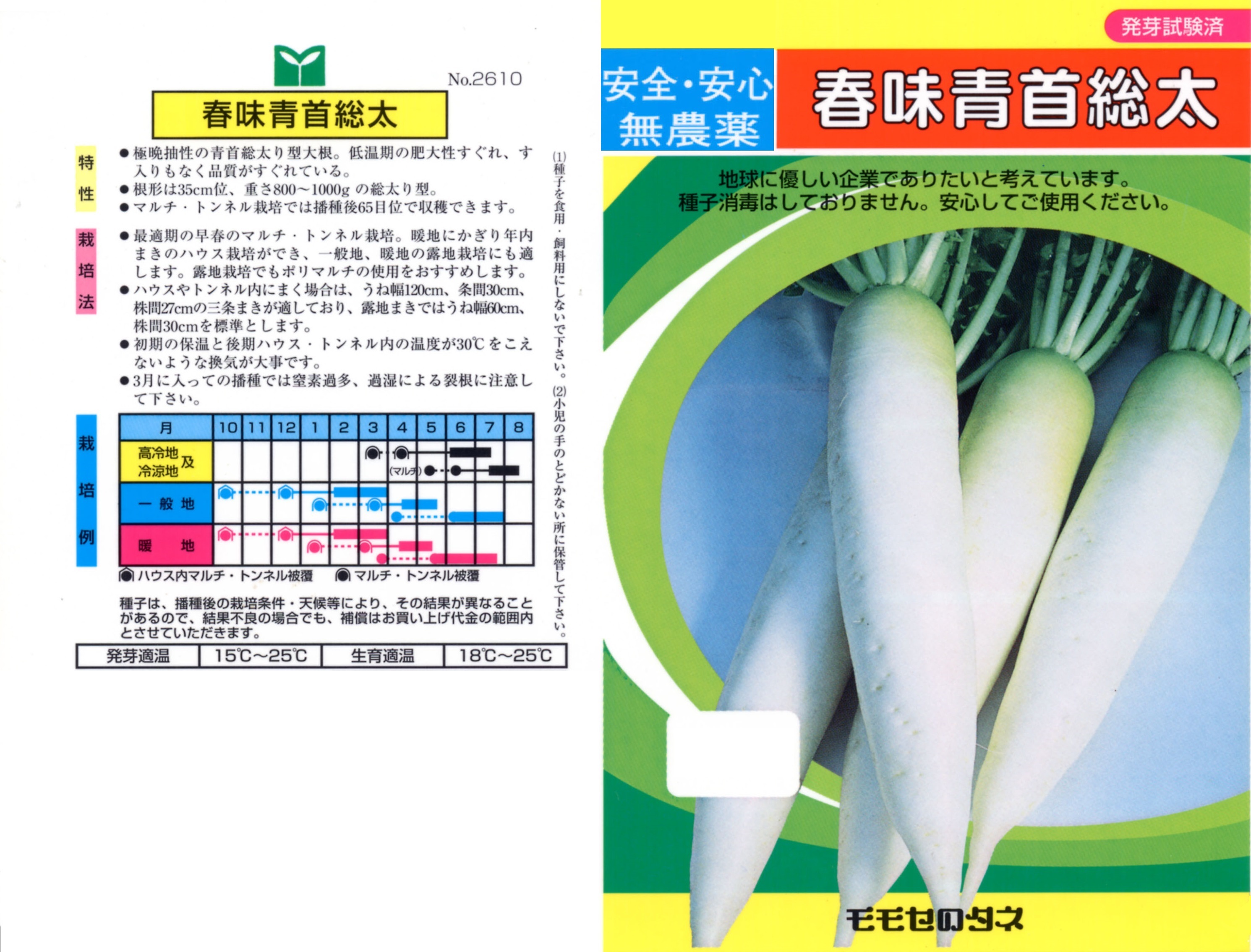 本種は、病気に強く、低温下でも良く太る大根です。春まき初夏~夏収穫の栽培ができ、大根の少なくなる時期に重宝します。根の長さは35~40cmぐらいの円筒形です。