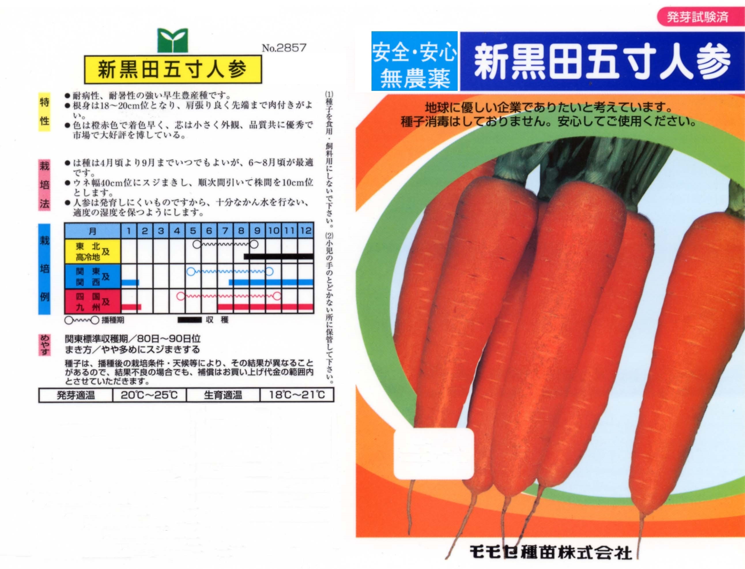 本種は、暑さや病気に強く、根の太りが早い品種です。根の色が濃く、食味は柔らかで、甘味に富んでいます。β-カロテンもニンジンの中ではトップクラスの含有量です。トウが立ちやすい性質ですので、夏まき専用で春まき栽培はできません。
