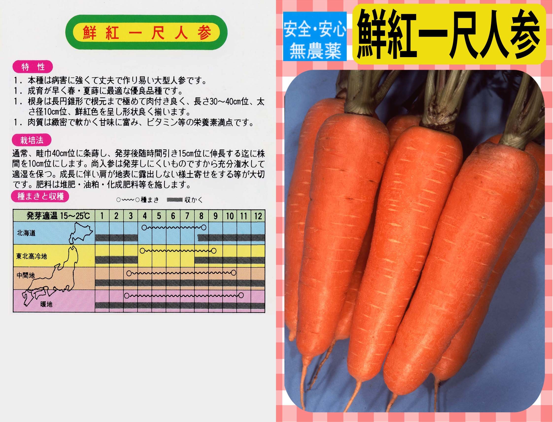 本種は、長さが30㎝ぐらいのニンジンです。色は濃い赤橙色で芯が細く中まで良く色づきます。通常の五寸人参より大きいのでボリュウーム満点です。病気にも強く作りやすいニンジンです。