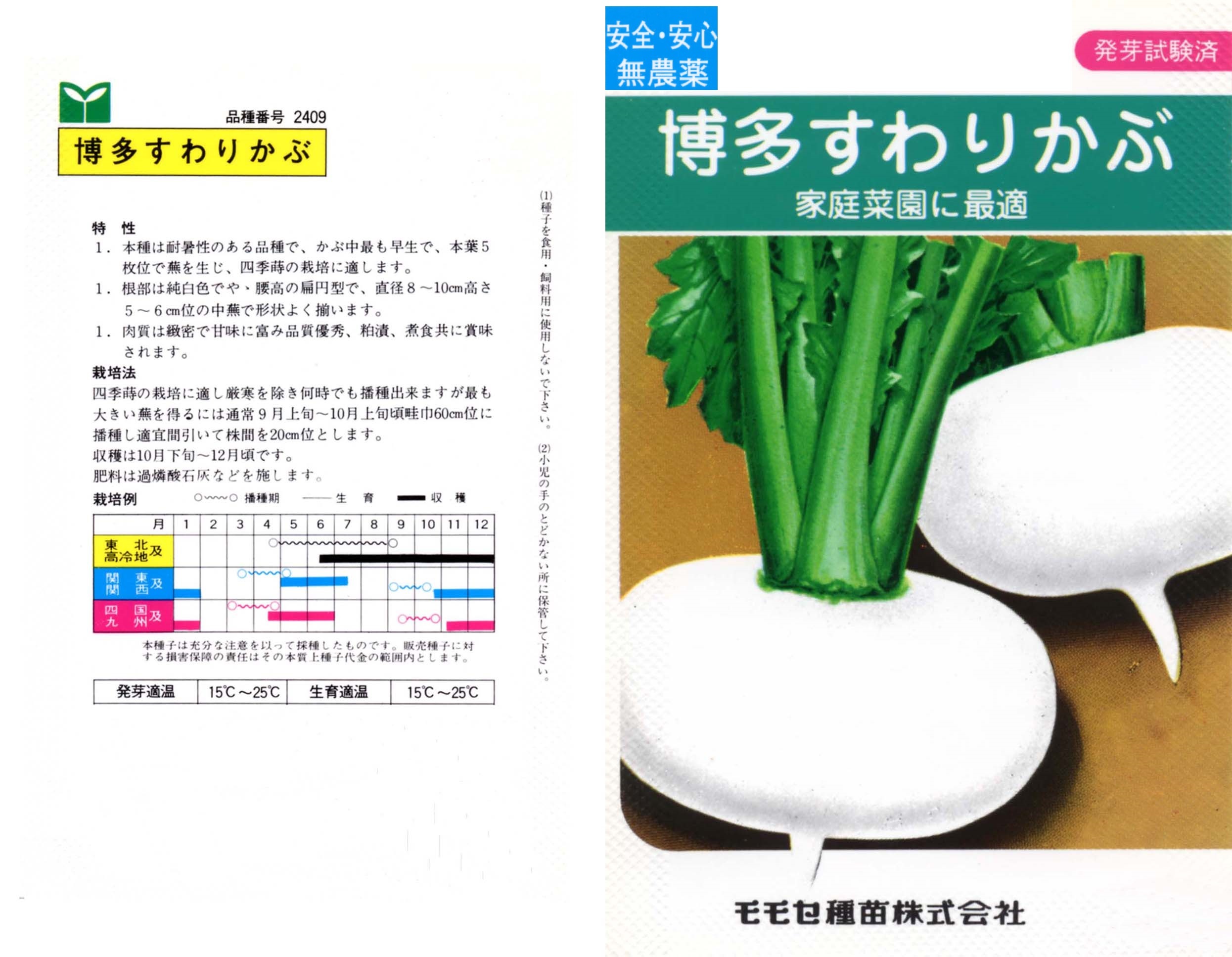 本種は、関西の天王寺かぶの系統で、大正時代に福岡市箱崎周辺で栽培されるようになったと言われています。葉の付け根にくぼみがあることから「据わりかぶ」と呼ばれたと言われています。やや扁平の白かぶで、肉質が緻密で美味しい中かぶです。