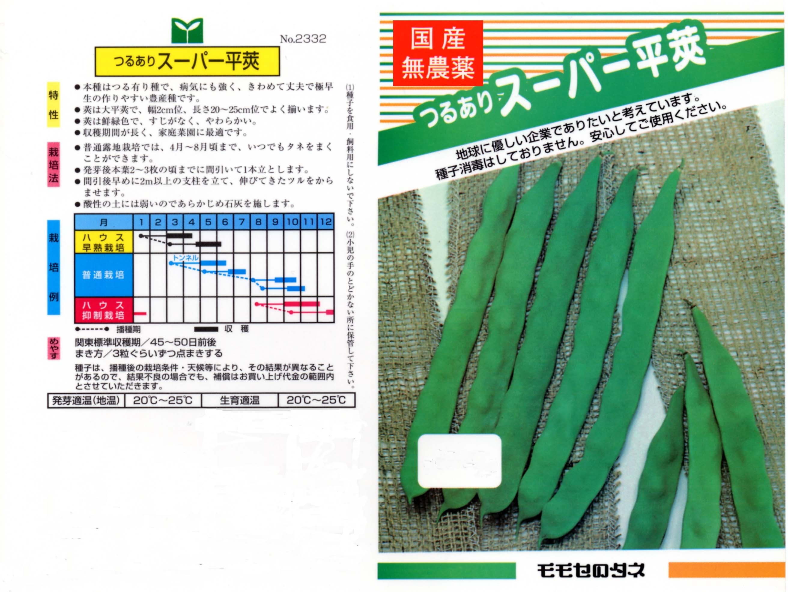 本種はサヤの長さが20~25㎝にもなる大平莢インゲンです。実成りが早く、丈夫で作りやすい品種です。サヤには筋がなく、甘味があり柔らかで、食味は上々です。