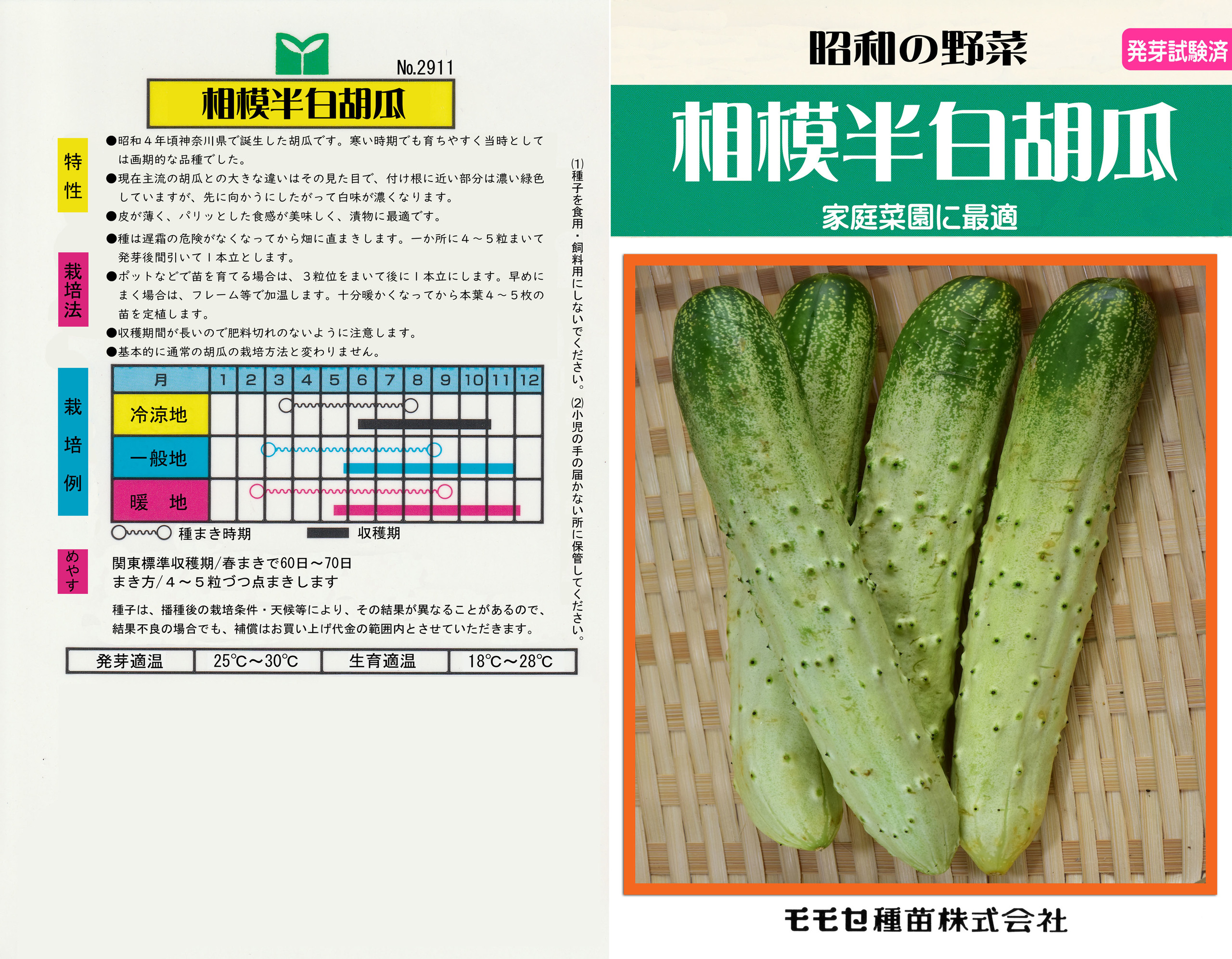 半白胡瓜は江戸時代以前に渡来した胡瓜が元とされ、首の近くの上部のみ緑色で、先に進むにつて白味を帯びてくるのが特徴です。相模半白胡瓜は、、江戸東京野菜の一つである馬込半白胡瓜の系統を元に昭和4年に神奈川県で改良された品種です。1960年代頃までには普及し半白胡瓜の主流となりました。胡瓜本来の風味が強く、パリッとした食感がおいしく浅漬けやサラダにむいています。首の近くに胡瓜特有の苦みが出やすいのがやや難点です。