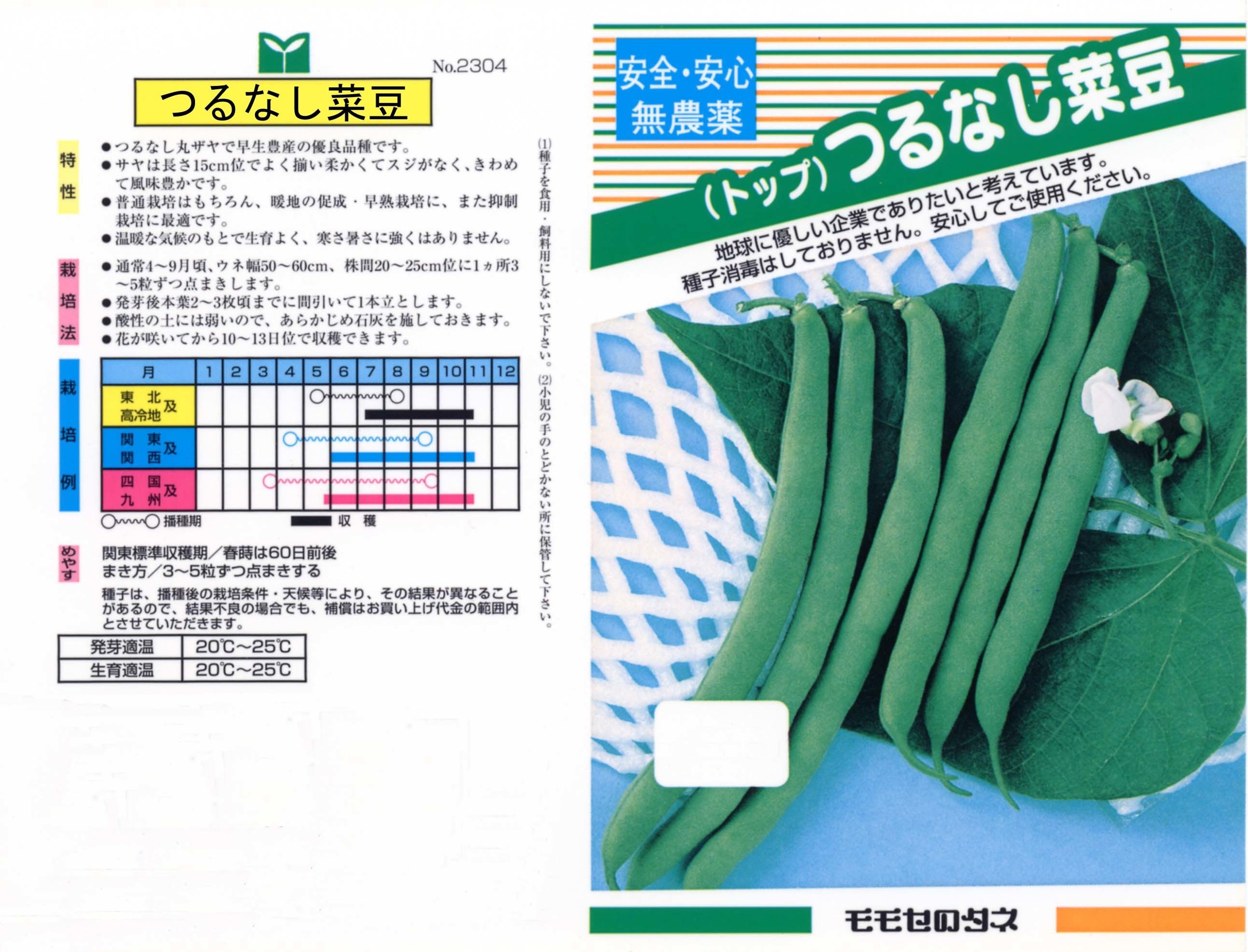 本種は、古くから栽培されている人気の高い固定種です。収穫までの期間が短く、病気に強く強健で、サヤが一斉に着く豊産種です。サヤは丸莢で筋がなく、長さ15㎝前後です。皮は柔らかく肉が厚く、食味は良好です。ツルが出ないのでプランターや鉢などでも栽培ができる家庭菜園に最適の品種です。