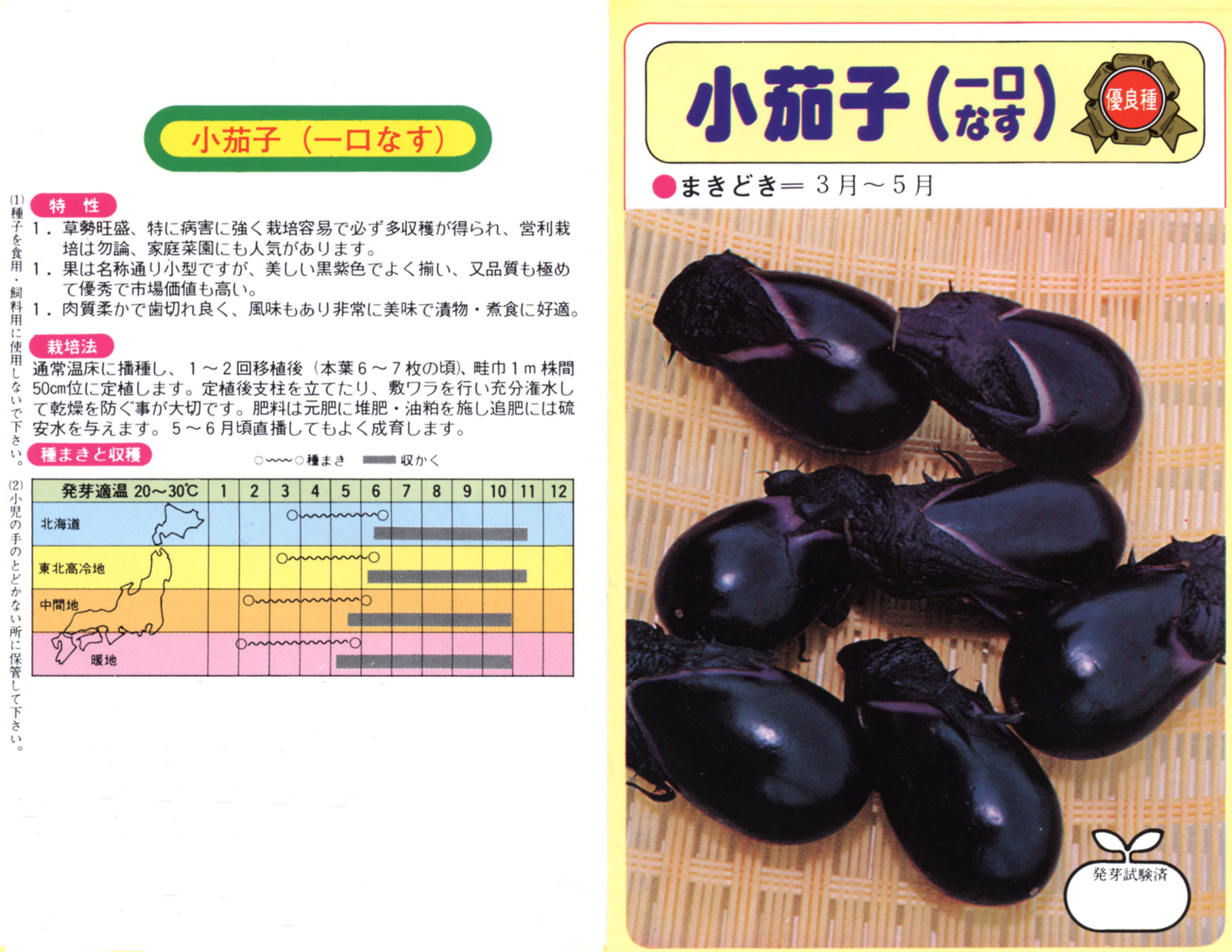 本種は、かわいい小型のナスです。皮が薄く肉質は緻密で、歯切れのよい漬物に最適の品種です。