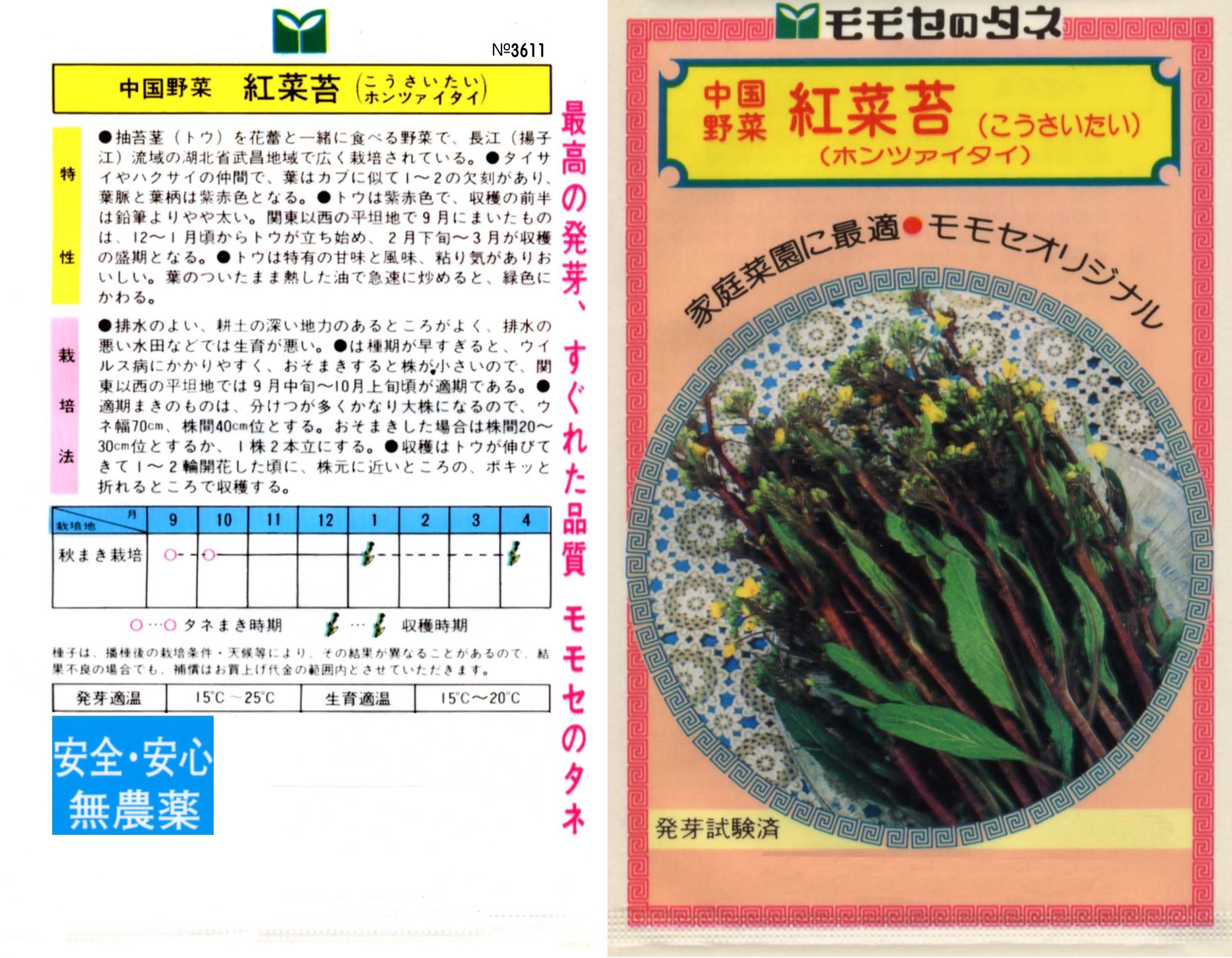 中国野菜 写真をクリックすると拡大します 【商品№】 3611【内容量】 5㎖【税込価格】¥330 紅菜苔 赤い茎と花を食べる野菜 中国揚子江中流域が原産のアブラナ科の野菜で、冬から春にかけて伸びる花茎と蕾を食べます。赤紫色の花茎は甘く粘りがあり、茹でると緑色に代わり、アスパラガスに似た風味となります。油いためやおひたし、温野菜やあえ物に利用できます。 【栽培のポイント】 あまり遅く種まきすると、小株となり収量が減ります。 基本的に丈夫ですので、放任栽培でも良く育ちます。 国産無農薬種子 国産無農薬種子(草花) 無農薬種子(葉物野菜) 無農薬種子(根物野菜) 無農薬種子(実物野菜) 楽しい野菜・珍しい野菜 郷土の野菜・伝統野菜 中国野菜 ハーブ 緑のカーテン スプラウト種子 ベビーリーフ種子 昭和の野菜