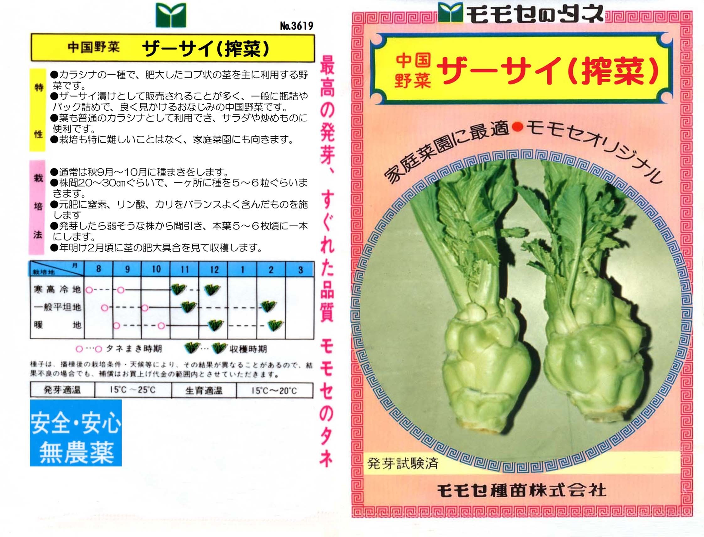 中国野菜 写真をクリックすると拡大します 【商品№】 3619【内容量】 5㎖【税込価格】¥330 ザーサイ(搾菜) ビン詰などで有名な中国野菜 一般に目にするのはビン詰やパック詰めにされた漬物が多い野菜です。カラシナの一種で、茎の部分が大きく肥大しているのが特徴です。漬物は中国の四川省の特産品として多く流通していますが、歴史は浅く1930年頃から知られるようになったと言われています。漬物以外にも葉をサラダや炒め物に利用できます。栽培も比較的簡単なので、家庭菜園でも収穫を楽しむことができます。 【栽培のポイント】 厳寒期はビニールなどで保護をするとよいでしょう。 国産無農薬種子 国産無農薬種子(草花) 無農薬種子(葉物野菜) 無農薬種子(根物野菜) 無農薬種子(実物野菜) 楽しい野菜・珍しい野菜 郷土の野菜・伝統野菜 中国野菜 ハーブ 緑のカーテン スプラウト種子 ベビーリーフ種子 昭和の野菜