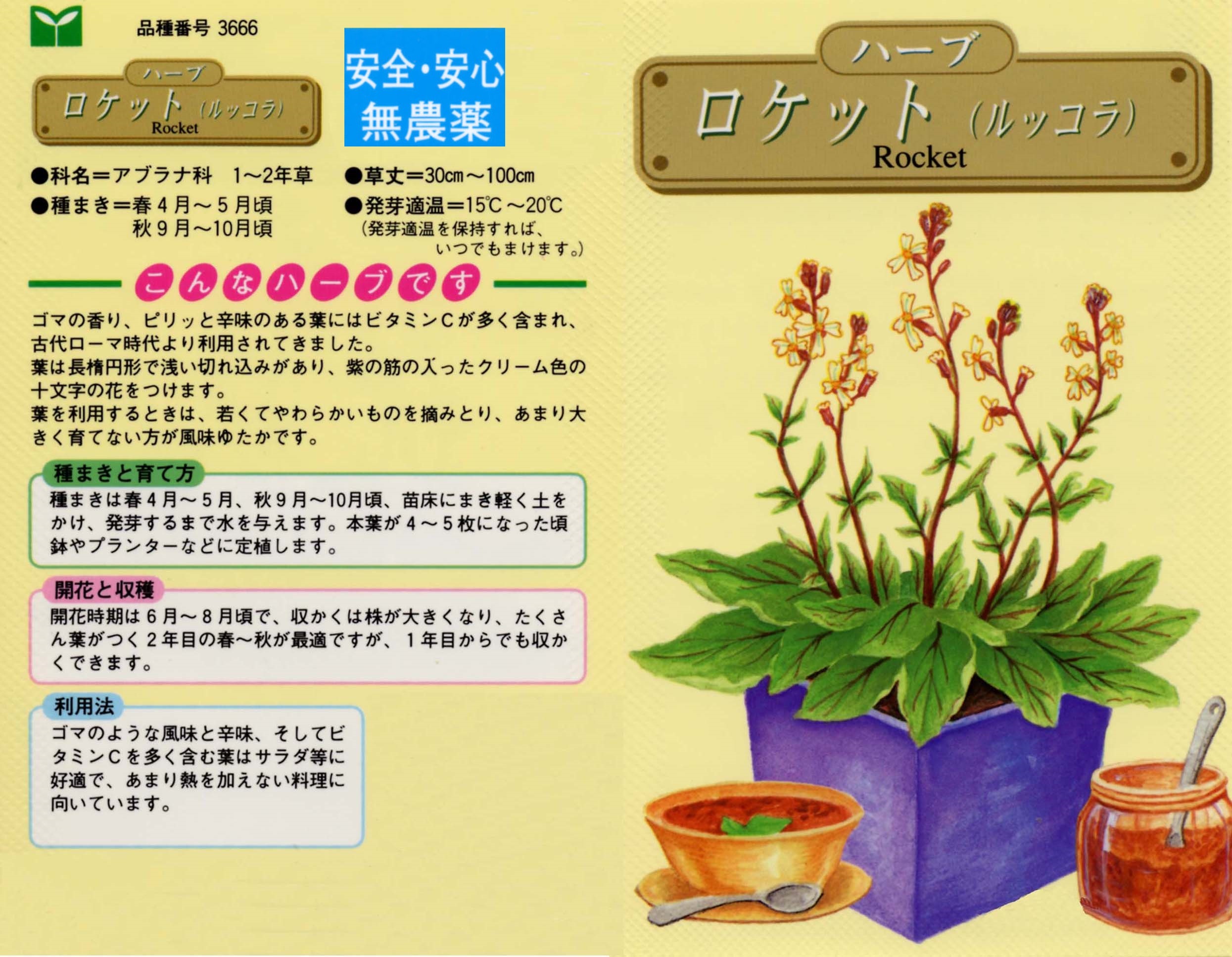 地中海沿岸地方原産の野菜でハーブの一つです。英名が「ロケットサラダ」でイタリア名が「ルッコラ」です。最大の特徴はゴマ風味の香りで、日本人にはなじみやすい香りです。食べるとピリッとした辛みも感じられます。ビタミンC・E、カルシウム、鉄などが豊富に含まれ生活習慣病の予防や血行促進、冷え症などに効果があると言われています。