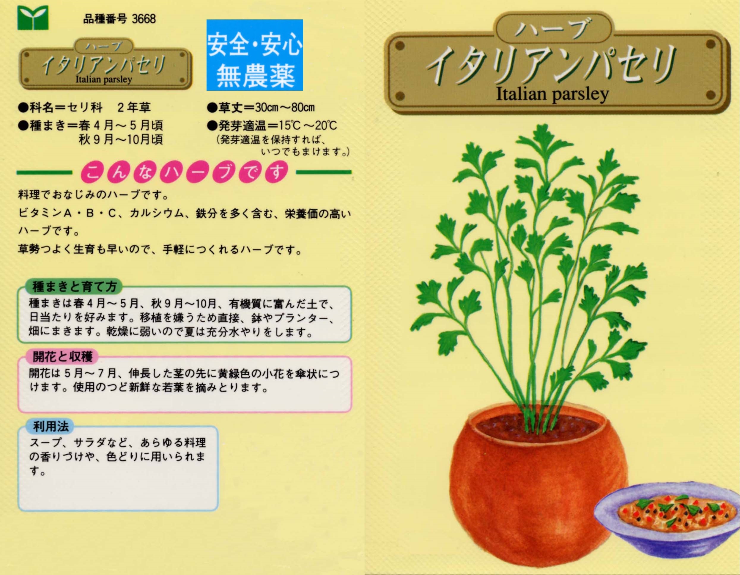 日本でよく見かける葉が縮れている種類のパセリより苦みやクセが少なく、味がマイルドなので食べやすい種類です。栄養価もパセリ同様に高く、もっと利用されてもよい野菜です。