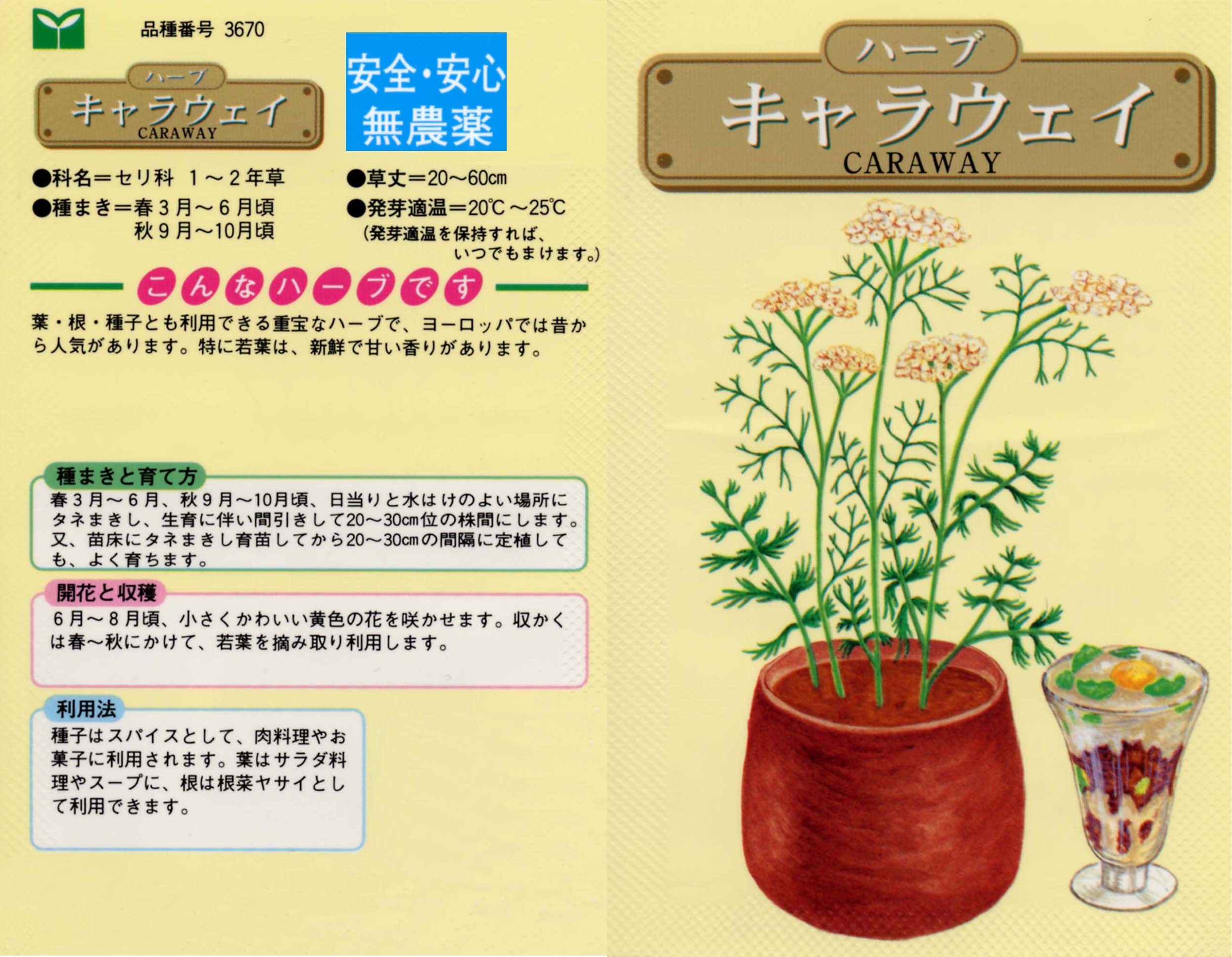 ヨーロッパや北アフリカに自生するセリ科の一年草で、石器時代の遺跡からも発見されているという古くから利用されているハーブです。アラビア語のカラウィーヤが変化してキャラウェイになったと言われています。ニンジンに似た細い羽状の葉と6月頃に咲く白いパラソル状の花が特徴です。若葉をサラダやスープに、種を菓子やお茶に使います。