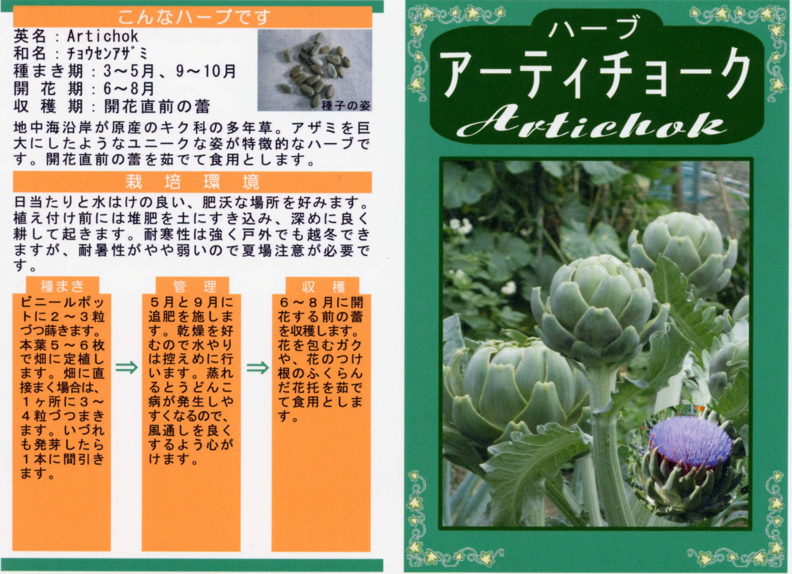 ハーブ 写真をクリックすると拡大します 【商品№】 3673【内容量】 2㎖【税込価格】¥330 アーティチョーク 巨大アザミのユニークな姿 キク科の多年草で、アザミを大きくしたような草姿をしています。ヨーロッパではポピュラーな野菜として流通しています。開花前の蕾を食用とします。花はドライフラワーとしても利用されています。イングリッシュガーデンの材料としても存在感があり最適です。 【栽培のポイント】 春と秋に種まきができますが、秋まきの方がどちらかというと早く花が楽しめて良いです。 国産無農薬種子 国産無農薬種子(草花) 無農薬種子(葉物野菜) 無農薬種子(根物野菜) 無農薬種子(実物野菜) 楽しい野菜・珍しい野菜 郷土の野菜・伝統野菜 中国野菜 ハーブ 緑のカーテン スプラウト種子 ベビーリーフ種子 昭和の野菜