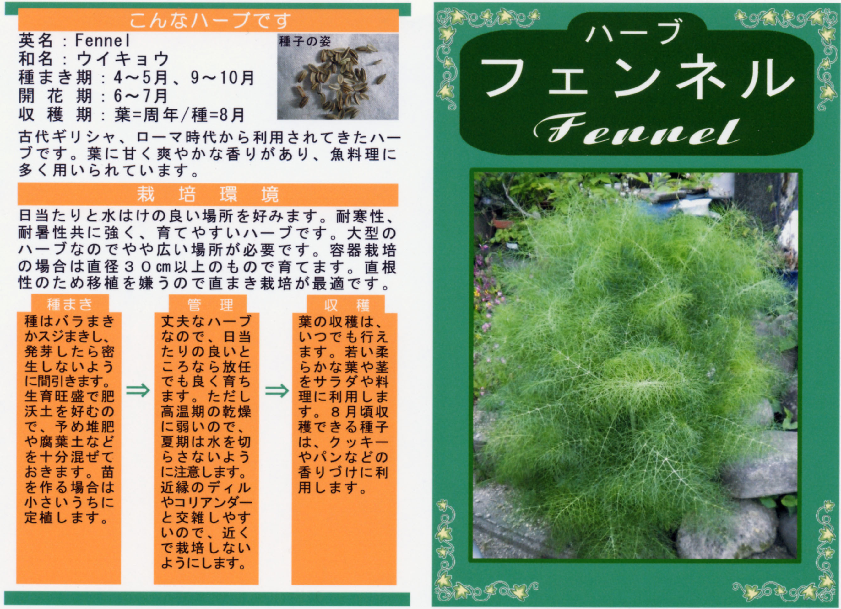 ハーブ 写真をクリックすると拡大します 【商品№】 3674【内容量】 1㎖【税込価格】¥330 フェンネル(ワイルド) 魚のハーブ 南ヨーロッパに自生するセリ科の多年草で、日本でも平安時代には知られていて、江戸時代には各地で栽培されていたと言われます。古代ローマ人に利用されていた歴史のあるハーブで、ヨーロッパでは魔法使いの霊草と言われることがあます。茎葉と種に甘い香りがあり、特に魚の臭みを消す効果があると言われています。茎葉を料理やハーブティ、ポプリで利用します。本種は根元が肥大しない品種です。 【栽培のポイント】 丈夫な多年草ですので、根付けば毎年芽を出し成長します。 国産無農薬種子 国産無農薬種子(草花) 無農薬種子(葉物野菜) 無農薬種子(根物野菜) 無農薬種子(実物野菜) 楽しい野菜・珍しい野菜 郷土の野菜・伝統野菜 中国野菜 ハーブ 緑のカーテン スプラウト種子 ベビーリーフ種子 昭和の野菜