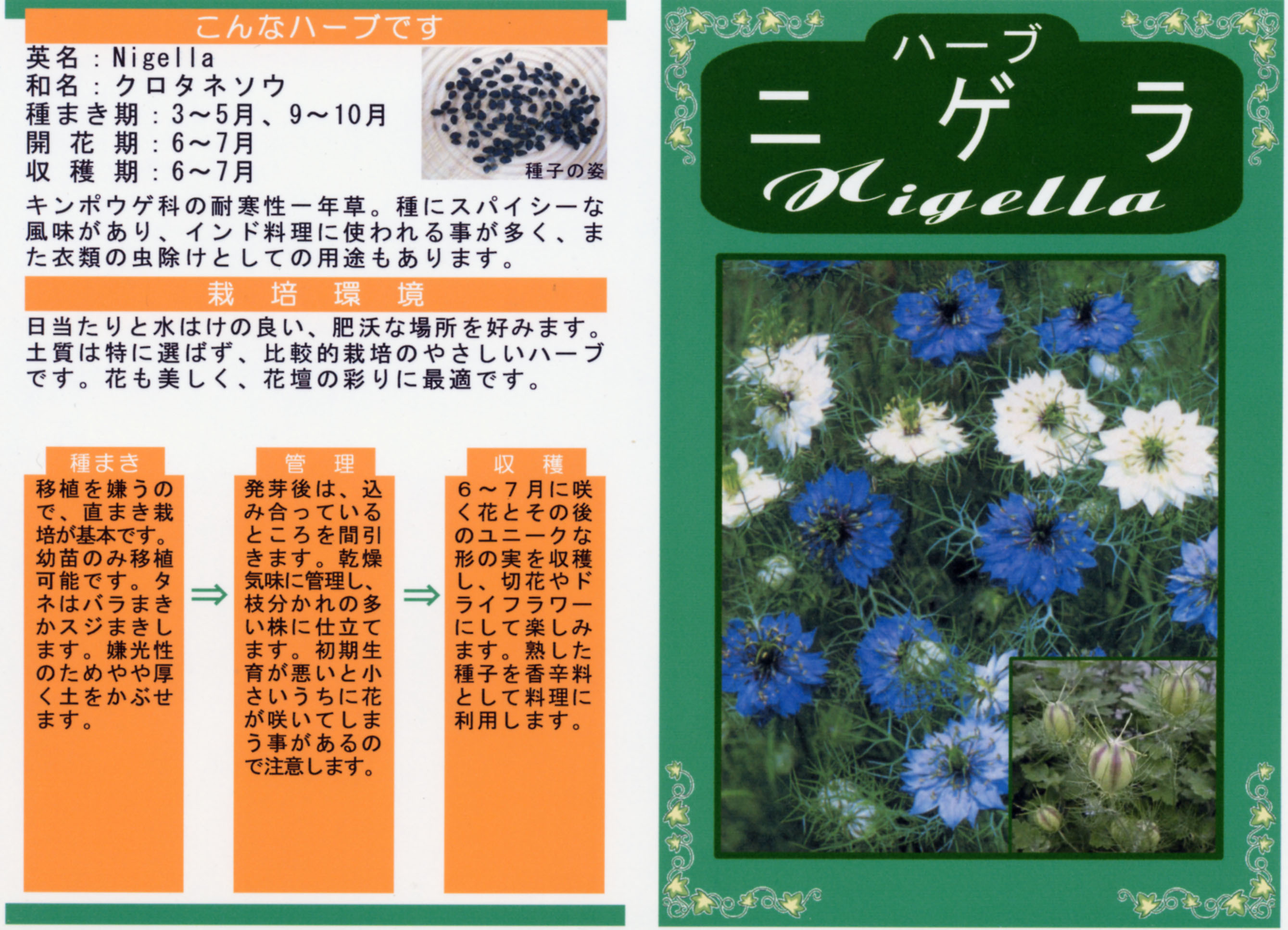 地中海沿岸に自生するキンポウゲ科の一年草で、幻想的な美しさから「ラブインナミスト(霧にひそむ愛)」とも呼ばれることもあります。特に花後にできる果実の形が変わっていて、ドライフラワーやハーブクラフトに利用されます。種子にイチゴのような芳香があり、スパイスとしてパンやケーキの風味付けに使われます。全草に毒性成分がありますので、ハーブとして使うのは種子のみです。ハーブガーデンの彩としての花の方が最適です。