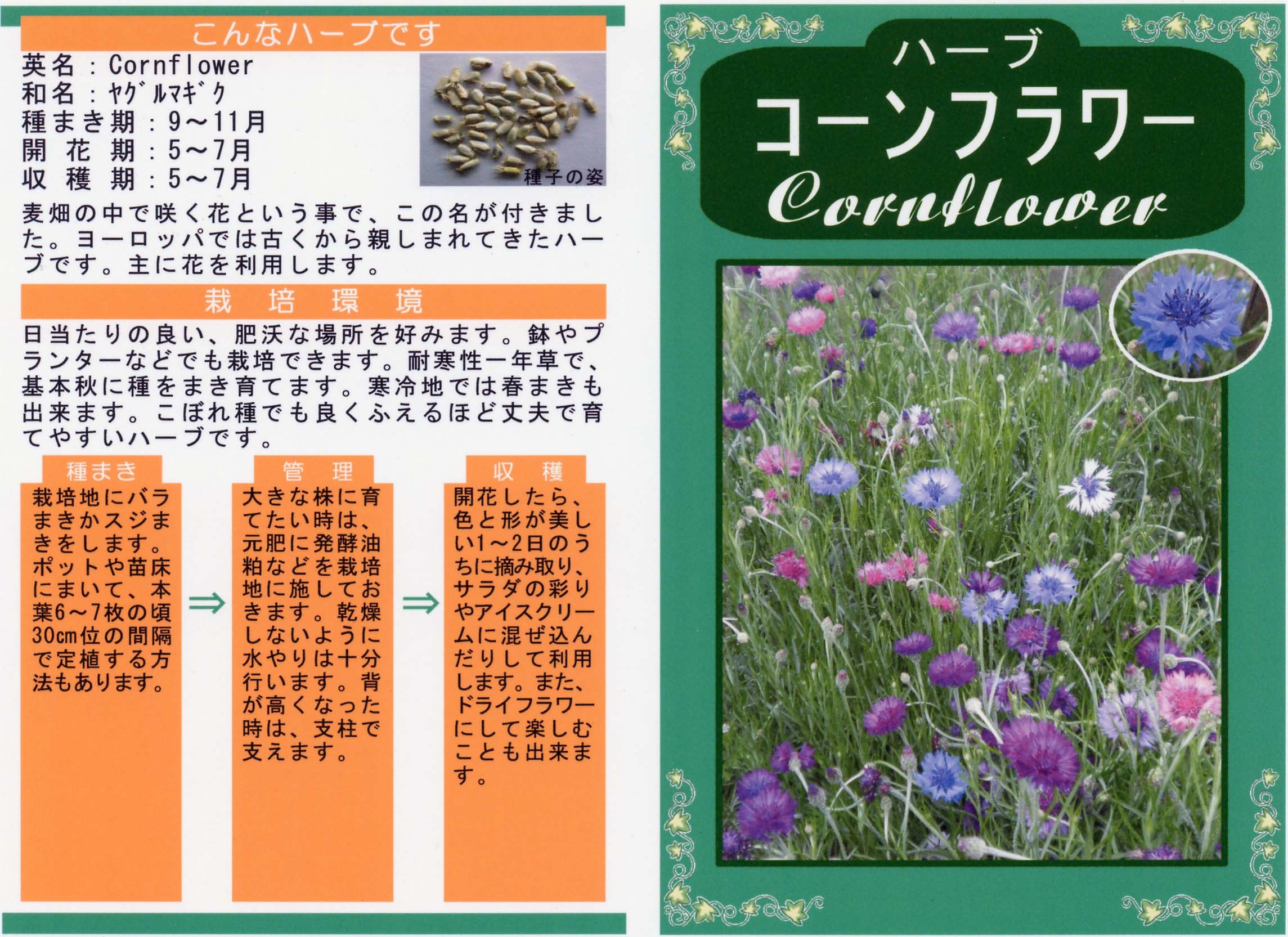 ハーブ 写真をクリックすると拡大します 【商品№】 3678【内容量】 2㎖【税込価格】¥330 コーンフラワー ナチュラルで素朴な雰囲気が素敵な花 ヨーロッパに自生するキク科の一年草で、日本でも古くからヤグルマギクと言われ親しまれています。花色は豊富ですが、青紫色が代表的な色で、青系統の染料に使われます。また乾燥しても色が抜けないので、ドライフラワーやポプリに使用します。乾燥した花には利尿や強壮に効果があると言われています。 【栽培のポイント】 背が高くなるので、倒伏防止に支えるものがあった方が良いでしょう。 国産無農薬種子 国産無農薬種子(草花) 無農薬種子(葉物野菜) 無農薬種子(根物野菜) 無農薬種子(実物野菜) 楽しい野菜・珍しい野菜 郷土の野菜・伝統野菜 中国野菜 ハーブ 緑のカーテン スプラウト種子 ベビーリーフ種子 昭和の野菜