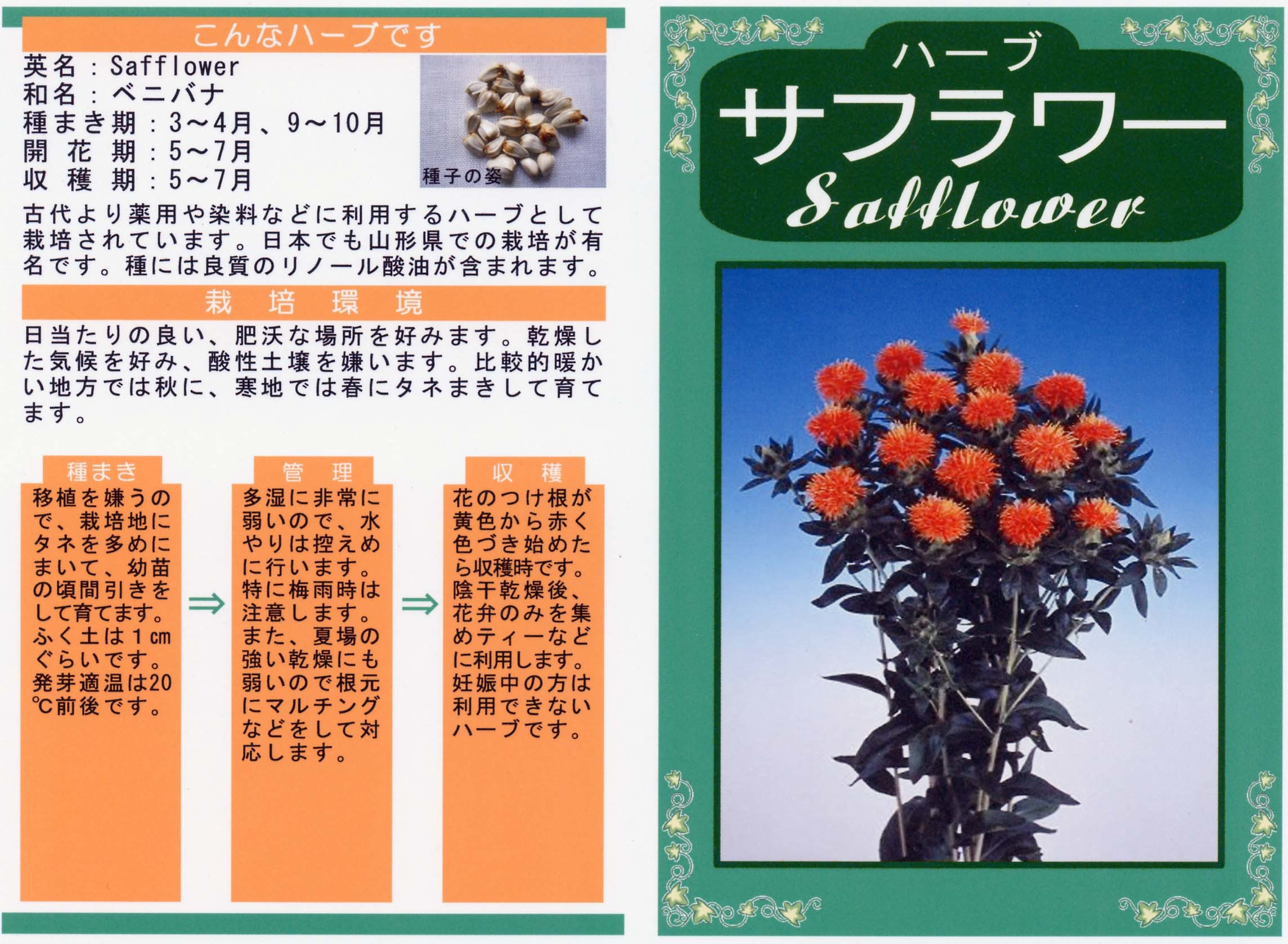 ハーブ 写真をクリックすると拡大します 【商品№】 3679【内容量】 1㎖【税込価格】¥330 サフラワー 古より染料や薬用に利用 エジプトに自生すると言われるキク科の一年草で、日本でも麻や藍と共に古くから染料や薬用に用いられてきたハーブです。現在は山形県の特産品です。花は染料として使われ、種からはリノール酸を含むサフラワー油が絞られます。石鹸やマーガリン、医薬用として利用されています。花を乾燥させ、ハーブティやポプリ、ドライフラワーに用います。また、夏の切り花としても価値があります。 【栽培のポイント】 移植を嫌うので、直まきか、ポットまきにして小さいうちに植え付けます。 国産無農薬種子 国産無農薬種子(草花) 無農薬種子(葉物野菜) 無農薬種子(根物野菜) 無農薬種子(実物野菜) 楽しい野菜・珍しい野菜 郷土の野菜・伝統野菜 中国野菜 ハーブ 緑のカーテン スプラウト種子 ベビーリーフ種子 昭和の野菜