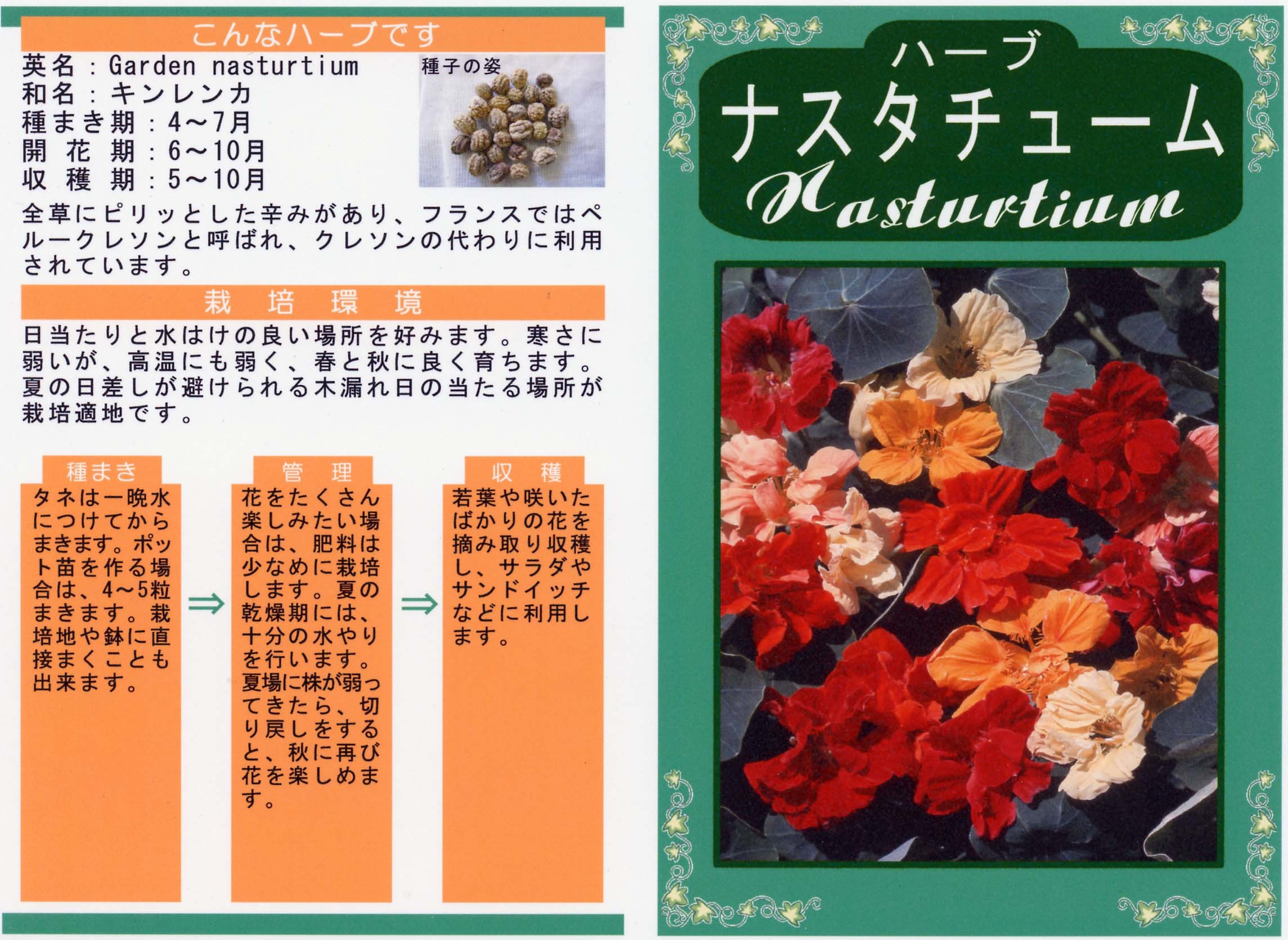 ハーブ 写真をクリックすると拡大します 【商品№】 3680【内容量】 2㎖【税込価格】¥330 ナスタチューム 葉はクレソンの風味 中南米に自生するノウゼンハレン科の一年草で、別名キンレンカと呼ばれています。ハスに似た葉にはビタミンCと鉄分を含み、ピリリとした辛みがありクレソンの風味に似ています。サラダやサンドイッチなどで生食します。若く柔らかい葉を摘み取り収穫します。 【栽培のポイント】 種皮が硬いので傷をつけるか、一晩水につけてからまくと発芽しやすくなります。 花を多く楽しみたい場合は、チッソ肥料は控えめにしましょう。 国産無農薬種子 国産無農薬種子(草花) 無農薬種子(葉物野菜) 無農薬種子(根物野菜) 無農薬種子(実物野菜) 楽しい野菜・珍しい野菜 郷土の野菜・伝統野菜 中国野菜 ハーブ 緑のカーテン スプラウト種子 ベビーリーフ種子 昭和の野菜
