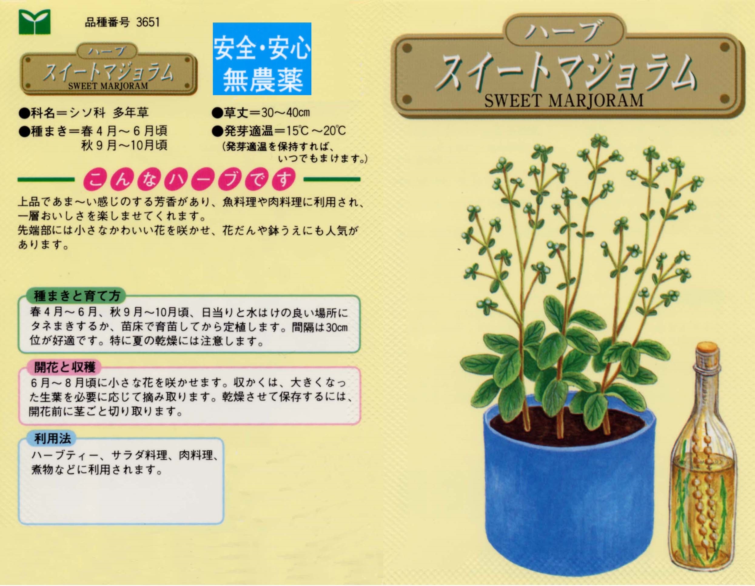 ハーブ 写真をクリックすると拡大します 【商品№】 3651【内容量】 0.3㎖【税込価格】¥330 スイートマジョラム 甘い香りとほのかな苦み 地中海沿岸から北アフリカなどに自生するシソ科ハーブで、葉や茎に甘く繊細な香りを持ちます。株全体がこんもりとまとまり、茎葉には細かな毛が生えています。初夏から夏にコロコロとした小さな白い花を咲かせます。新鮮な葉を肉のにおい消しに利用します。また、オムレツなどの卵料理と相性がよく利用されます。 【栽培のポイント】 高温多湿が苦手なので乾燥気味に管理します。 国産無農薬種子 国産無農薬種子(草花) 無農薬種子(葉物野菜) 無農薬種子(根物野菜) 無農薬種子(実物野菜) 楽しい野菜・珍しい野菜 郷土の野菜・伝統野菜 中国野菜 ハーブ 緑のカーテン スプラウト種子 ベビーリーフ種子 昭和の野菜