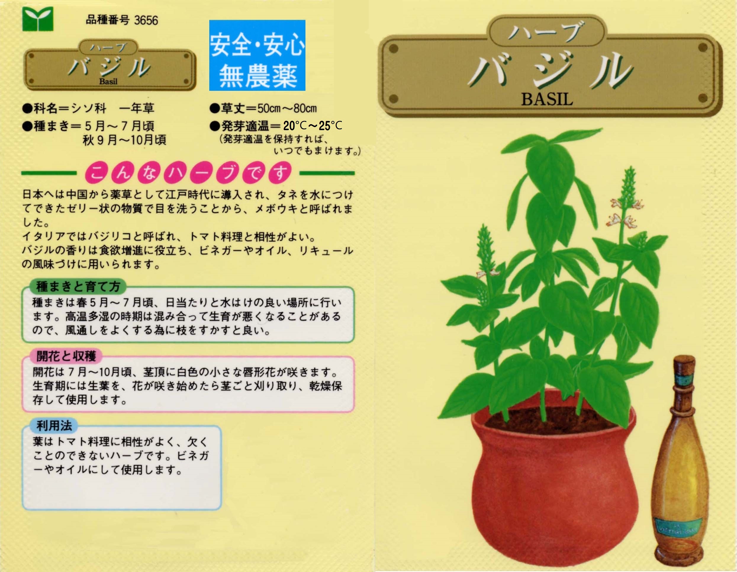 ハーブ 写真をクリックすると拡大します 【商品№】 3656【内容量】 1㎖【税込価格】¥330 バジル ハーブの王様 ハーブ類の中で最も有名なバジルは、インドや熱帯アジア原産のシソ科の一年草です。株全体に甘い香りとほのかな辛味があり、いろいろな料理に利用されています。ビタミンやミネラルが豊富で、香り成分には鎮静作用、食欲増進、抗菌作用があるとされています。 【栽培のポイント】 密植しすぎると風通しが悪くなり、病害虫の発生を招くので注意しましょう。 鉢栽培ではサイズが小さすぎると生育が悪く、下葉から枯れることがあります。 好光性種子ですので、種まき後の土は薄くかけるようにしましょう。 国産無農薬種子 国産無農薬種子(草花) 無農薬種子(葉物野菜) 無農薬種子(根物野菜) 無農薬種子(実物野菜) 楽しい野菜・珍しい野菜 郷土の野菜・伝統野菜 中国野菜 ハーブ 緑のカーテン スプラウト種子 ベビーリーフ種子 昭和の野菜