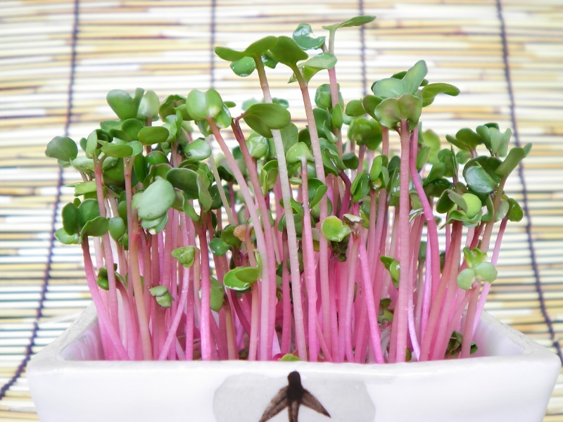 お馴染みのかいわれ大根のピンクタイプです。軸の色が鮮やかなピンク色に染まります。カロテンやビタミンCが多く、抗酸化、抗菌作用の効果があると言われています。