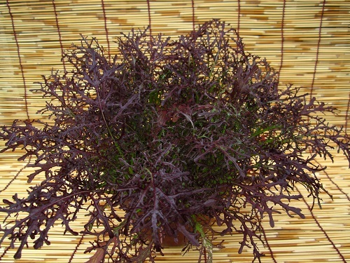 水菜を思わせる切れ込みの深い赤銅色の葉が特徴的な品種です。からし菜の仲間なので葉にはさっぱりとした辛みを持ちます。葉色は大きくなるにつれ濃くなります。また、高温期の栽培では葉色は薄くなります。
