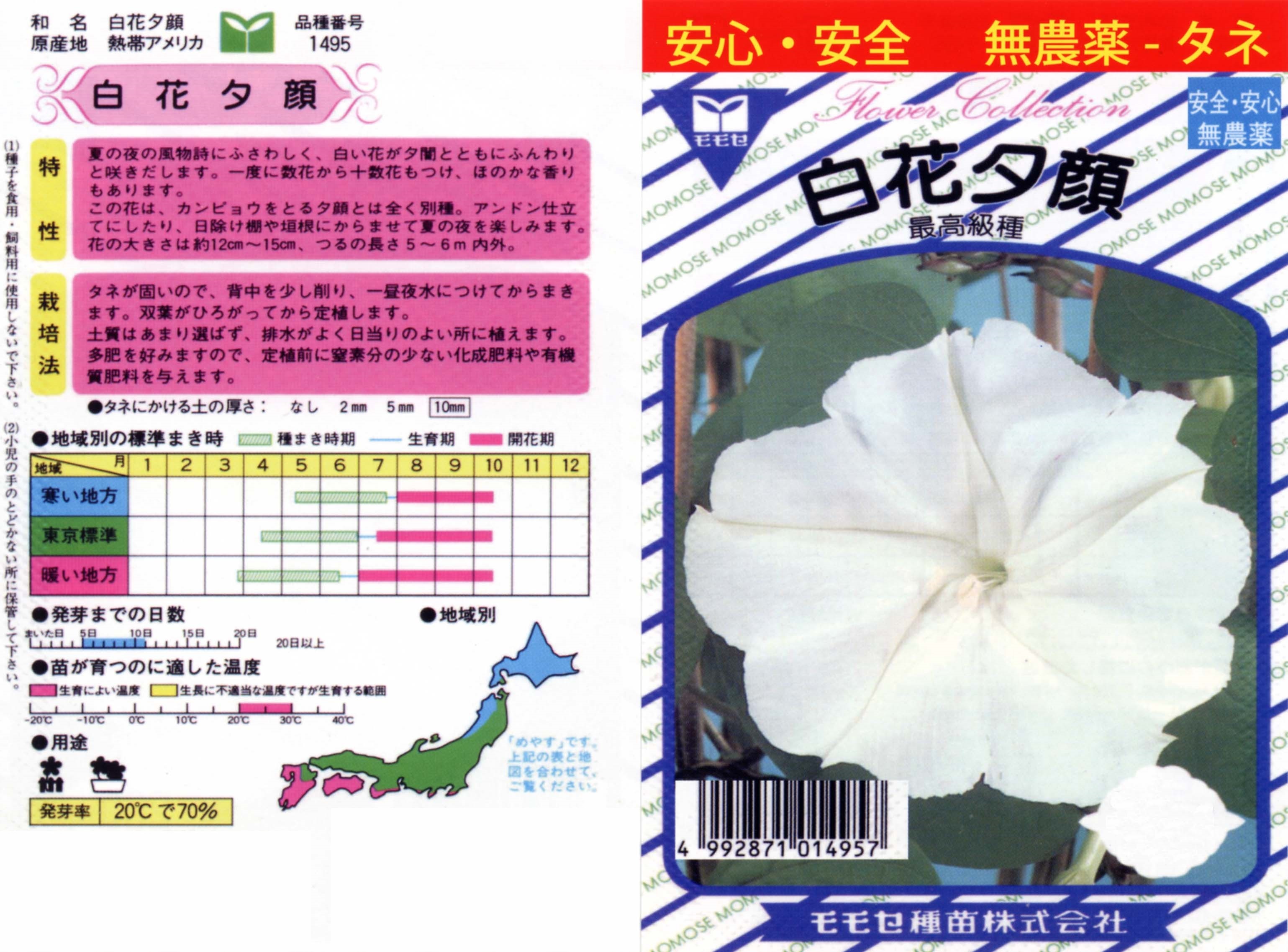 北米フロリダ地方原産の一年草です。花は夕方から咲き始めて夜の間咲き続け、翌朝にしぼみます。開花と同時にやわらかな香りを放ち、あたりに漂わせる神秘的な魅力のある花です。月明かりの下で観賞するのもおすすめです。蔓もよく伸びるのでグリーンカーテンに最適で、また垣根に絡ませたり、行灯仕立てでも楽しめます。カンピョウをとる夕顔とは別物です。