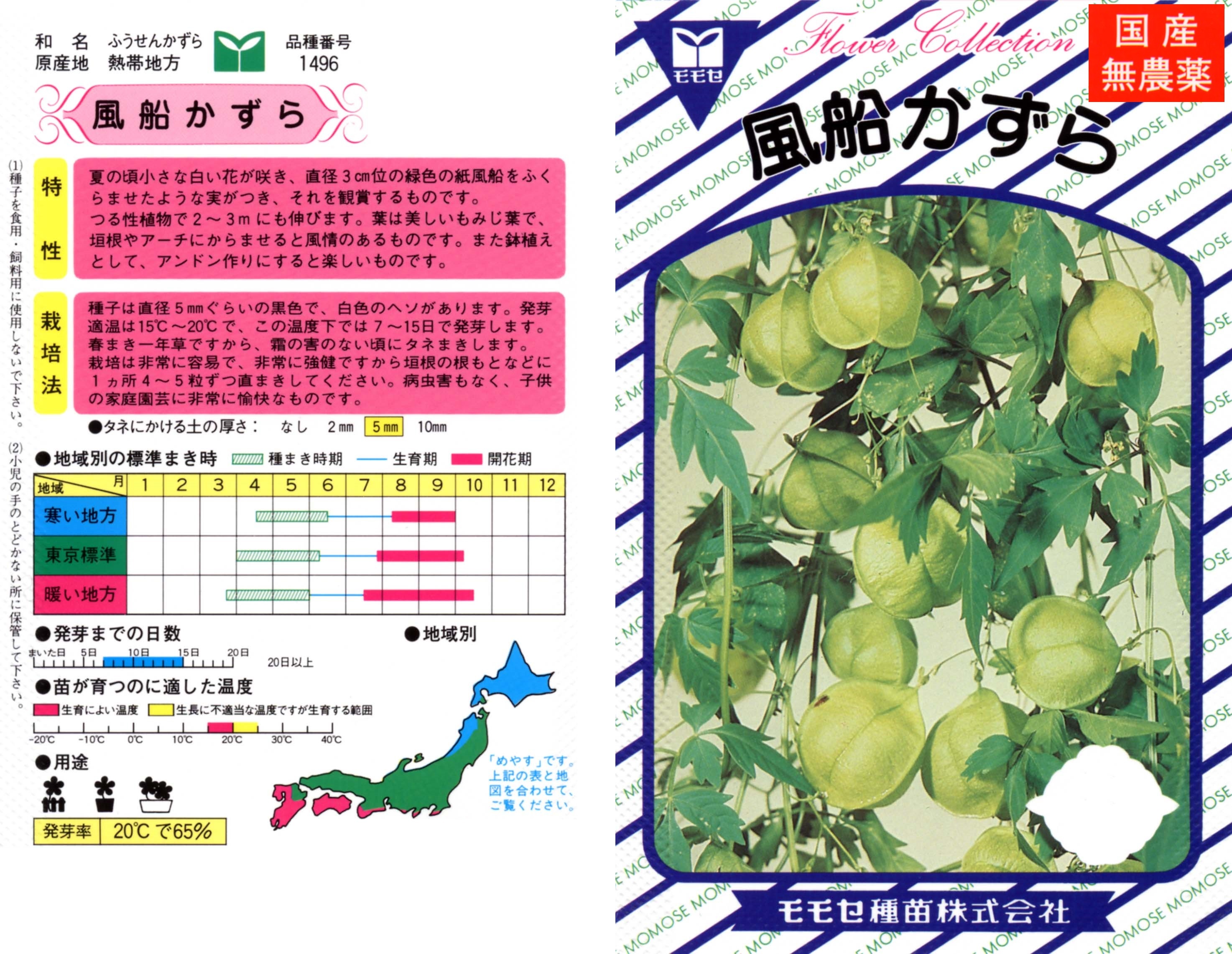 緑のカーテン 写真をクリックすると拡大します 【商品№】 1496【内容量】 2㎖【税込価格】¥330 風船かずら 緑のバルーンが鈴なり 熱帯地方原産の一年草です。小さな白い花が咲いた後、緑色の紙風船を膨らませたような実がたくさんできます。非常に面白い草姿で、夏から秋の花として人気があります。生育旺盛で丈夫なので、温度さえあれば手間なく育てられます。鉢植えで行灯仕立てにしても楽しめます。種のハート模様もかわいいです。 【栽培のポイント】 種皮が硬く発芽しずらい時があるので、一度に全ての種をまかずに、発芽しないときは種皮のハート形の白い部分を傷をつけるなどしてまき直ししましょう。 国産無農薬種子 国産無農薬種子(草花) 無農薬種子(葉物野菜) 無農薬種子(根物野菜) 無農薬種子(実物野菜) 楽しい野菜・珍しい野菜 郷土の野菜・伝統野菜 中国野菜 ハーブ 緑のカーテン スプラウト種子 ベビーリーフ種子 昭和の野菜