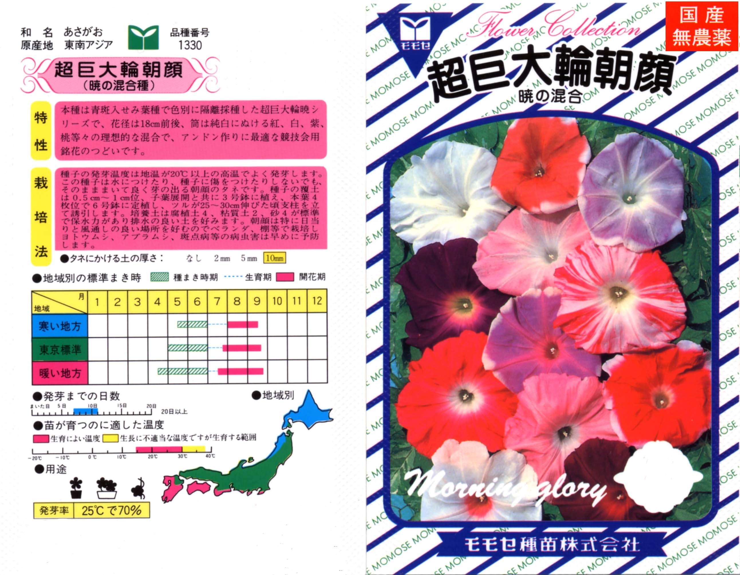 本種は花径が18cm前後になる超巨大輪朝顔で、コンテストなどに参加できる素質を持っています。栽培も比較的育てやすく、家庭菜園には最適の品種です。つるもよく伸びるので、グリーンカーテンにもおすすめです。花色は混合となっています。