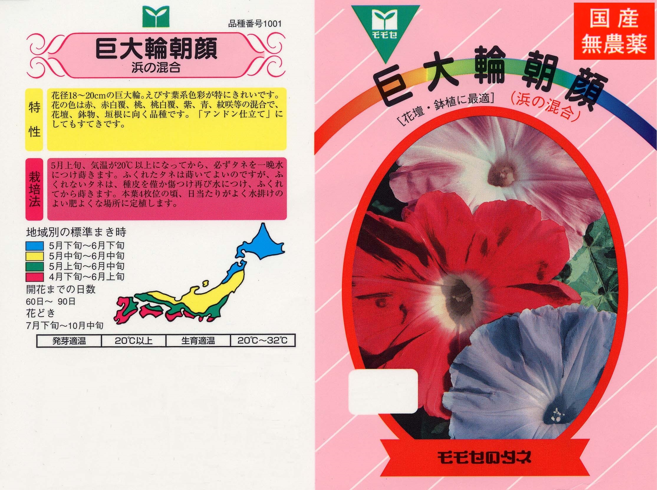 本種は朝顔の代表的な種類で、花が大きく観賞価値があり、栽培も比較的育てやすく、家庭菜園には最適の品種です。つるもよく伸びるので、グリーンカーテンにもおすすめです。花色は混合となっています。