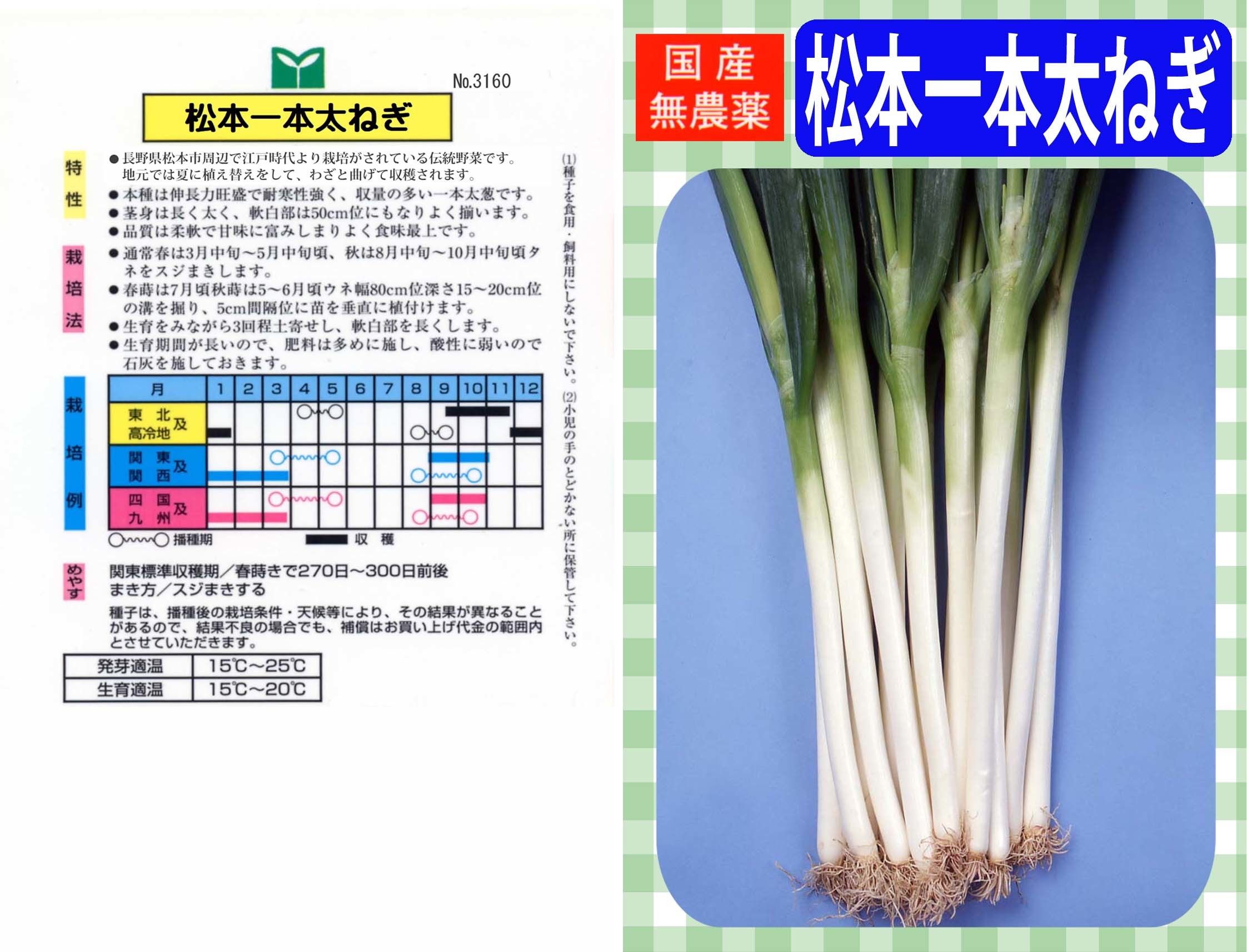 松本一本太ねぎは長野県松本市周辺で江戸時代より栽培され、徳川家にも献上されていたと言われる美味しいねぎです。お隣群馬県下仁田町特産の「下仁田ねぎ」と同じ仲間で、肉質柔らかく、甘味と風味に富み、鍋物に最適の品種です。松本市の名物「桜鍋」にもよく使われます。地元では、夏に植え替えを行い、わざと斜めに植えて曲がりねぎにして出荷販売しています。