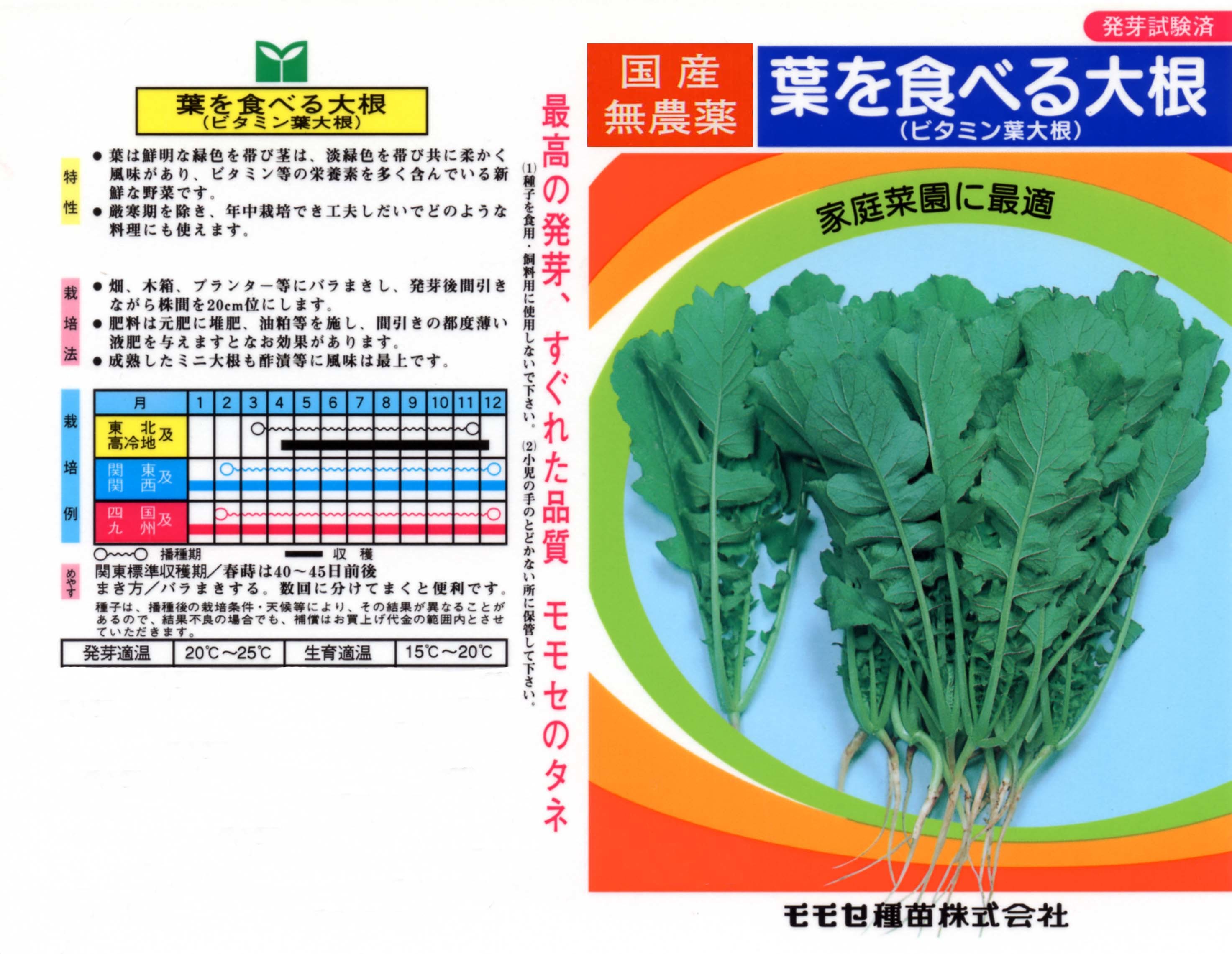 本種は栄養満点の大根の葉を手軽に栽培できるように改良された優良種で、プランターや鉢などでほぼ一年中簡単に作ることができます。炒め物や温サラダ、汁物の具にと非常に重宝します。