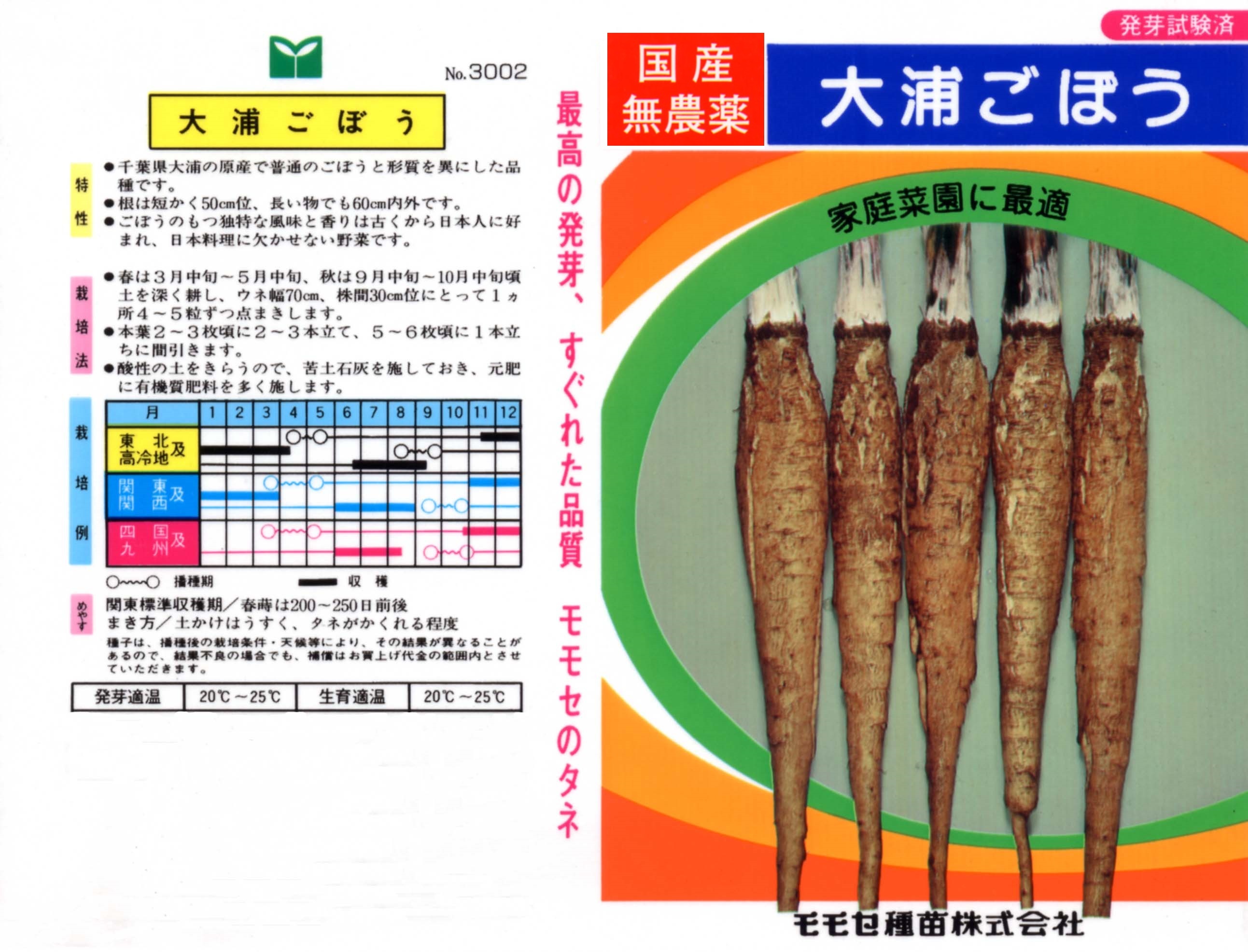 千葉県匝瑳市大浦地区で栽培されているので「大浦ごぼう」と呼ばれます。平安時代、平将門の乱を鎮めるために朝廷より任じられた藤原秀郷が、戦勝祈願のため成田山新勝寺に訪れた際、大浦ごぼうを食べて戦に勝利したという伝説があり、それ以来「勝ちごぼう」と呼ばれる縁起物として扱われるようになりました。現在でも大浦地区で栽培されたものは、そのほとんどが成田山新勝寺に奉納され、精進料理として出されています。見た目がきれいとはお世辞にも言い難く、ブサイクな野菜ですが、味や香りは抜群に良いごぼうです。太さは直径10㎝前後もあり、長さは50~60cm前後、中が空洞になっているのも大きな特徴です。あまり市場には出回らないので、家庭菜園でしか味わえない野菜です。