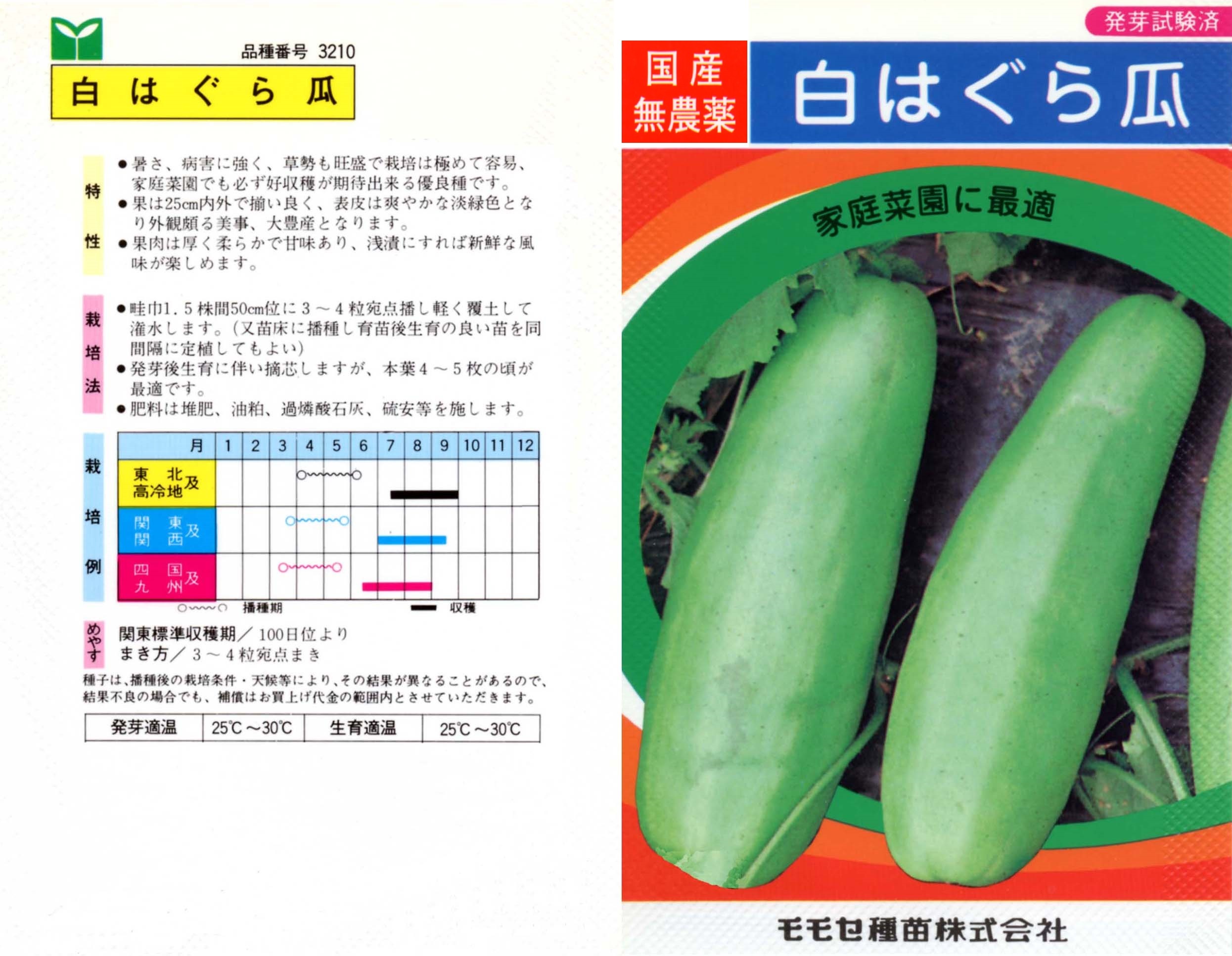 国産無農薬種子 写真をクリックすると拡大します 【商品№】 3210【内容量】 1.5㎖【税込価格】¥330 白はぐら瓜 千葉県の伝統野菜 千葉県の成田市周辺が主な産地で、白瓜の仲間でまくわ瓜との交雑でできたと言われます。食感が柔らかく「歯がぐらついている人でも食べられる」とこの呼び名が付いたと言われます。成田名産の「鉄砲漬け」ははぐら瓜を漬けたものです。 本種は表皮が白い種類で性質は強健で非常に作りやすい品種です。 【栽培のポイント】 実は子ヅル孫ズルになるので、本葉5~7枚ぐらいで必ず摘心しましょう。 国産無農薬種子 国産無農薬種子(草花) 無農薬種子(葉物野菜) 無農薬種子(根物野菜) 無農薬種子(実物野菜) 楽しい野菜・珍しい野菜 郷土の野菜・伝統野菜 中国野菜 ハーブ 緑のカーテン スプラウト種子 ベビーリーフ種子 昭和の野菜