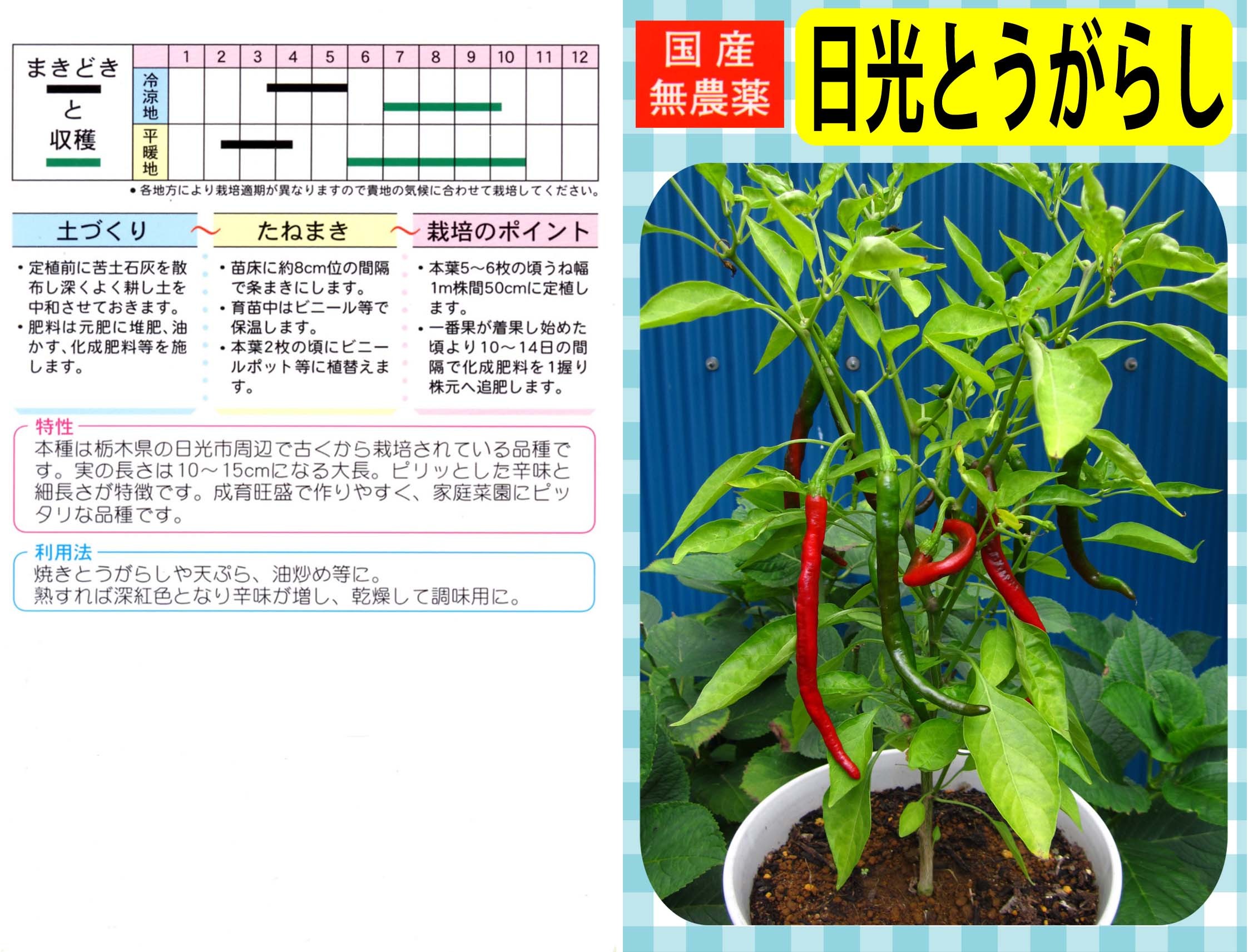 国産無農薬種子 写真をクリックすると拡大します 【商品№】 3404【内容量】 1㎖【税込価格】¥330 日光とうがらし 栃木県日光市の在来種 栃木県日光市付近で昔から作られている伝統野菜で、緑のうちは辛みか少なく、赤く熟すと辛みが増します。果実は10~15㎝ぐらいで下向きにつきます。緑のうちは炒め物や佃煮等に利用します。また、葉も「葉とうがらし」として使われます。極めて丈夫で分枝も多く、よく繁茂します。草丈は60~70㎝ぐらいになります。畑のほか、鉢やプランターでも手軽に作れます。 【栽培のポイント】 発芽適温が高いので種まき育苗はビニールを被せるなどして温度を上げるように努めましょう。 国産無農薬種子 国産無農薬種子(草花) 無農薬種子(葉物野菜) 無農薬種子(根物野菜) 無農薬種子(実物野菜) 楽しい野菜・珍しい野菜 郷土の野菜・伝統野菜 中国野菜 ハーブ 緑のカーテン スプラウト種子 ベビーリーフ種子 昭和の野菜