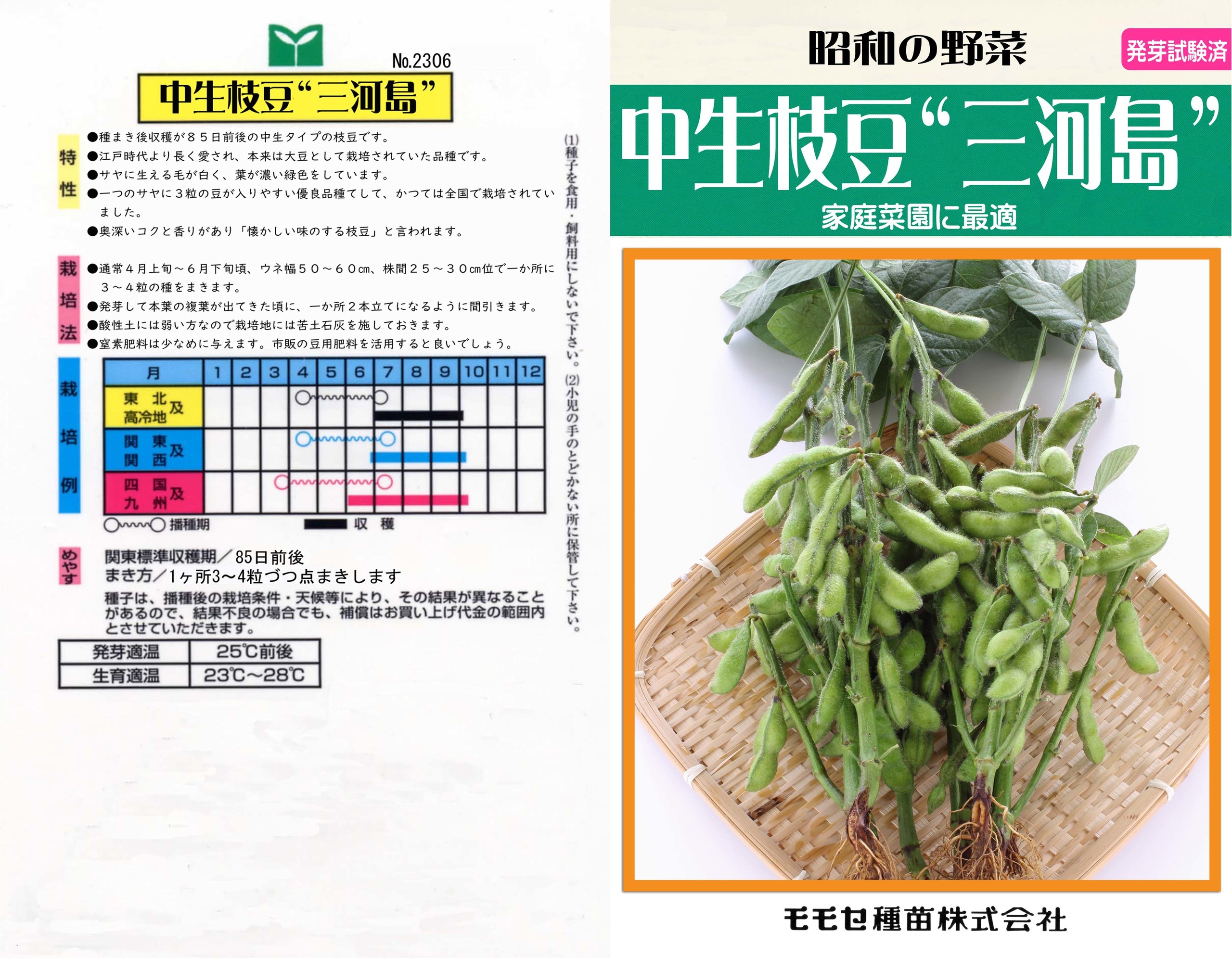 本種は現在の東京都荒川区荒川のかつて三河島と呼ばれていた地域で栽培されていた枝豆と言われ、夏大豆型で温度さえあれば実を結びますが、早生種よりやや収穫までの時間がかかります。種まきから収穫まで関東標準で80~90日くらいです。実入りもよく、3粒莢率が高い品種です。草勢は強く、多く枝分かれし着莢も良好です。豆は大粒で甘味と風味があり、食味は上々です。