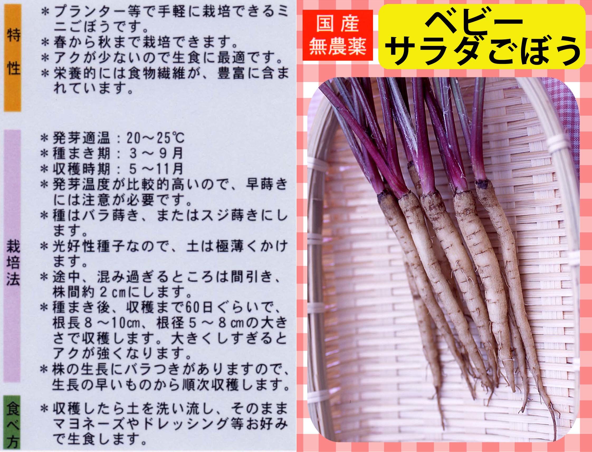 本種はプタンターや鉢などでも栽培ができるごぼうです。柔らかくアクも少なく、うまみの多い皮ごと生食できるので、収穫して洗ってマヨネーズ等で美味しくいただけます。