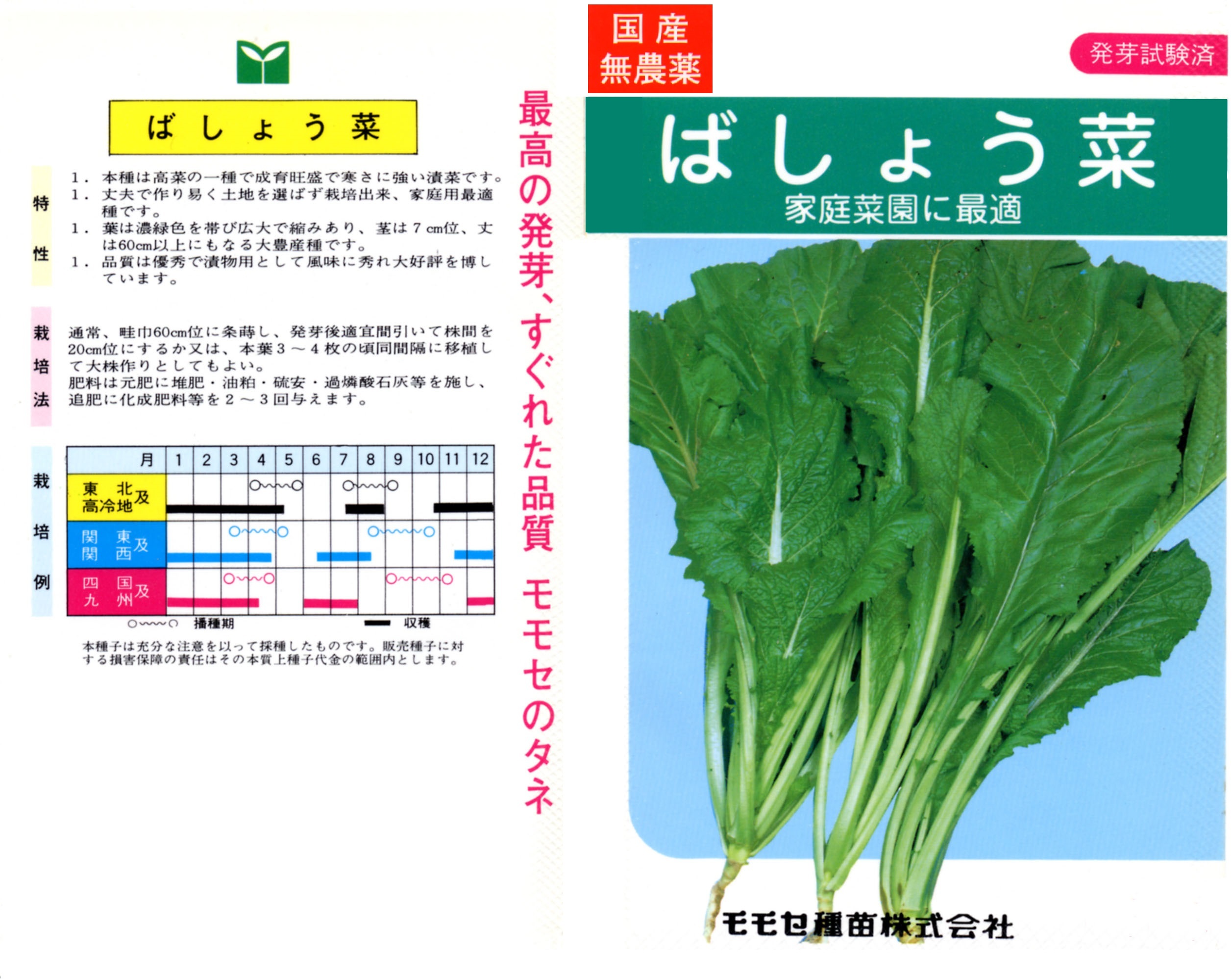 国産無農薬種子 写真をクリックすると拡大します 【商品№】 2049【内容量】 5㎖【税込価格】¥330 ばしょう菜 宮城県の伝統野菜 芭蕉の葉の似ているのでこの名が付きました。葉が60cm以上にもなる大型の漬菜で、菜種から分化したものではないかと言われいます。江戸時代から明治にかけて漬物用として広く栽培され、現在に至っています。漬け物、煮食に利用します。 【栽培のポイント】 春と秋に種まきできますが、秋栽培の方が美味しくなります。 国産無農薬種子 国産無農薬種子(草花) 無農薬種子(葉物野菜) 無農薬種子(根物野菜) 無農薬種子(実物野菜) 楽しい野菜・珍しい野菜 郷土の野菜・伝統野菜 中国野菜 ハーブ 緑のカーテン スプラウト種子 ベビーリーフ種子 昭和の野菜