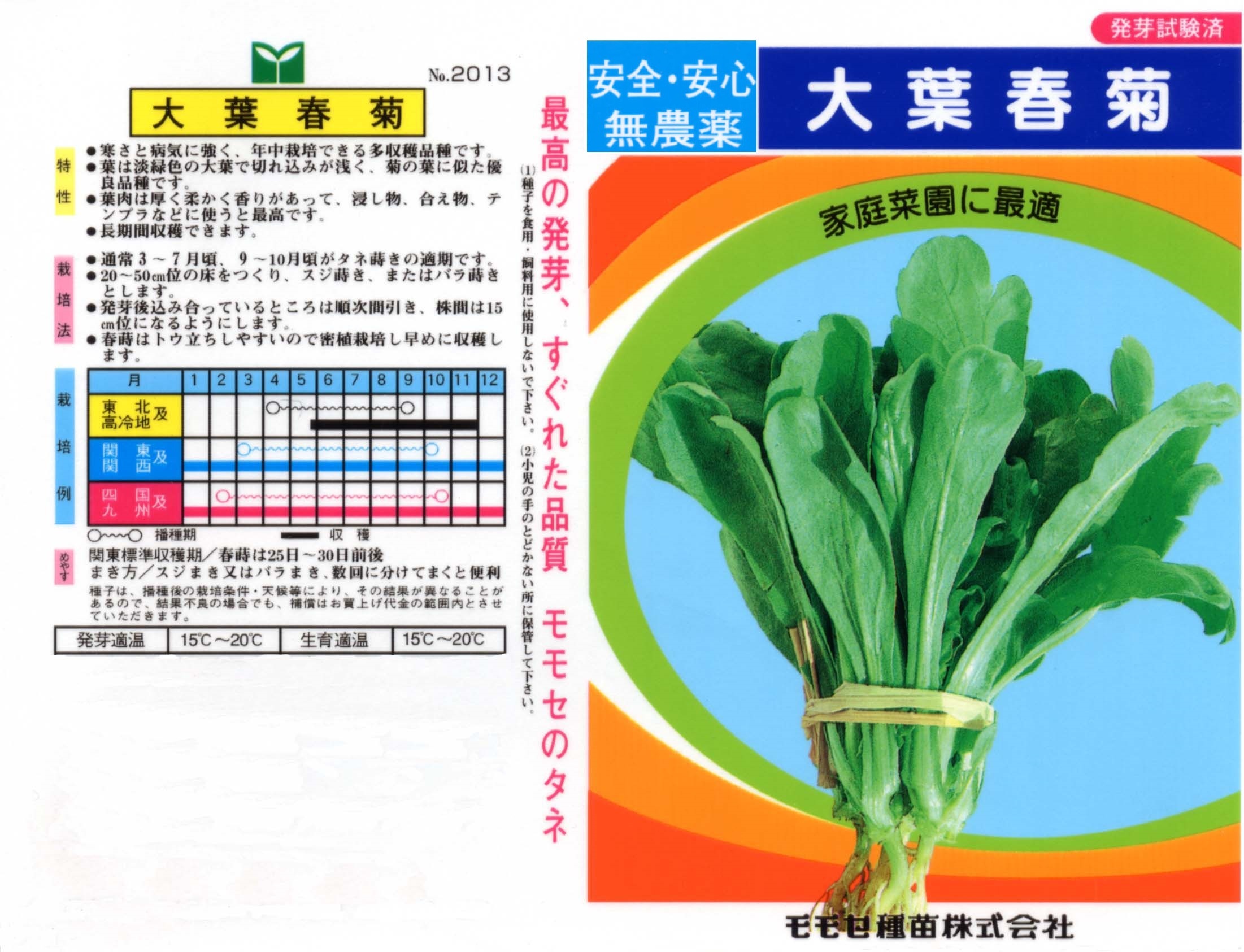 東日本で多く食べられる中葉春菊とは違い、葉に細かな切れ込みのない品種です。最大の特徴は春菊嫌いの元凶となるクセや香り、苦みなどが少ないことです。葉肉が厚く柔らかく、サラダで食べても美味しくいただけます。山口県下関付近では「ローマ」というオシャレな名前で売られている場合もあり、「ふぐ鍋」に使われるそうです。中葉春菊同様、栽培も簡単です。
