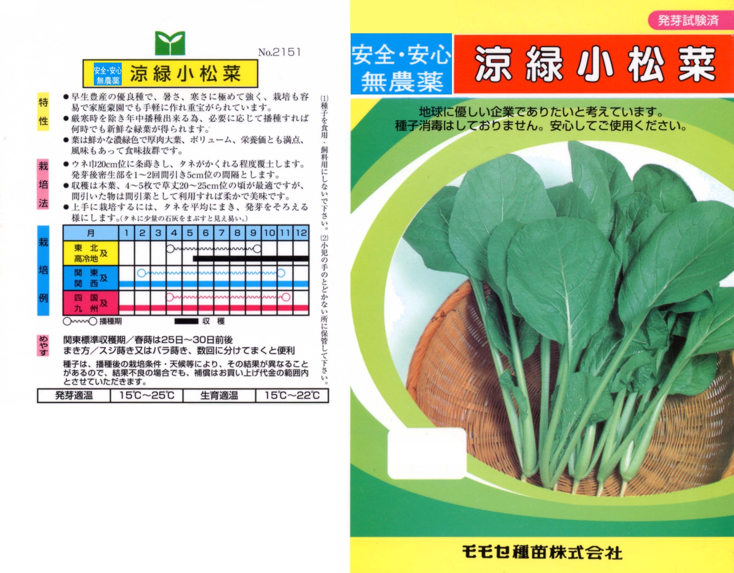 無農薬種子(葉物野菜) 写真をクリックすると拡大します 【商品№】 2151【内容量】 10㎖【税込価格】¥220 涼緑小松菜 作りやすいF1小松菜 本来の小松菜は葉が寝ることがあり、土がかぶり汚れるため洗うのに手間がかかることがありました。 本種は改良により葉が立ち、作りやすくした小松菜です。さらに茎がしっかりして幅があり、揃いも従来より良くなりました。暑さにも強くなり、真夏でも安定して収穫ができます。 【栽培のポイント】 間引きの手間を楽にするため、種のまき過ぎに注意しましょう。春先の栽培は、花が咲く恐れがあるので、あまり大きくしないで収穫しましょう。 国産無農薬種子 国産無農薬種子(草花) 無農薬種子(葉物野菜) 無農薬種子(根物野菜) 無農薬種子(実物野菜) 楽しい野菜・珍しい野菜 郷土の野菜・伝統野菜 中国野菜 ハーブ 緑のカーテン スプラウト種子 ベビーリーフ種子 昭和の野菜