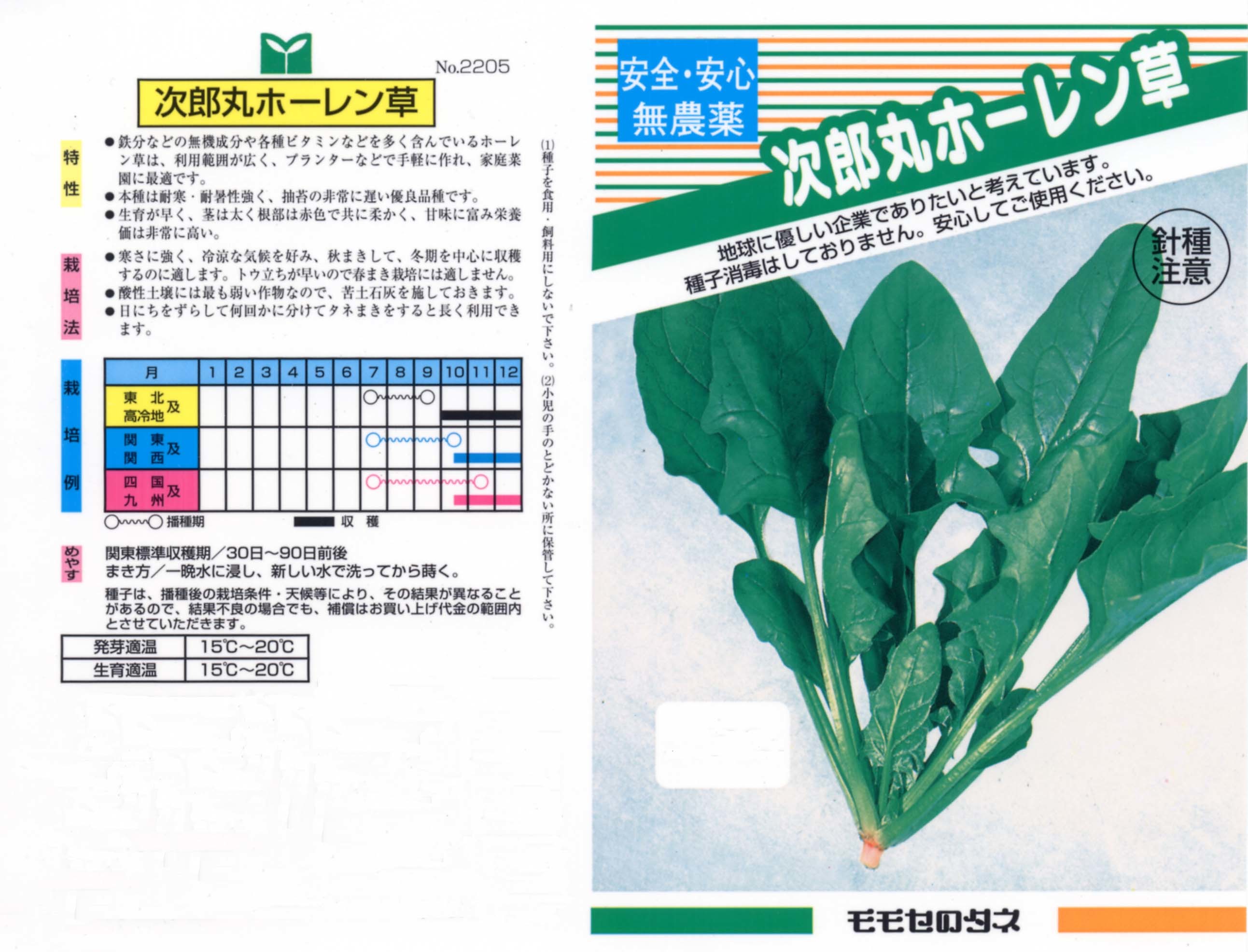 愛知県稲沢市治郎丸付近が原産地で明治時代から栽培がされていました。東洋種と西洋種の自然交雑により誕生したと言われています。葉の切れ込みが多く、やや細身の草姿をしています。根ぎわは鮮やかな紅色をしています。耐寒性が強く寒さに当たると甘さが増し、「ホーレン草てこんなに美味しいの」と思わせる味です。特に捨ててしまいがちな根本の赤い部分の味は格別です。春から夏は花が咲いてしまうので、秋から冬作専用のホーレン草です。