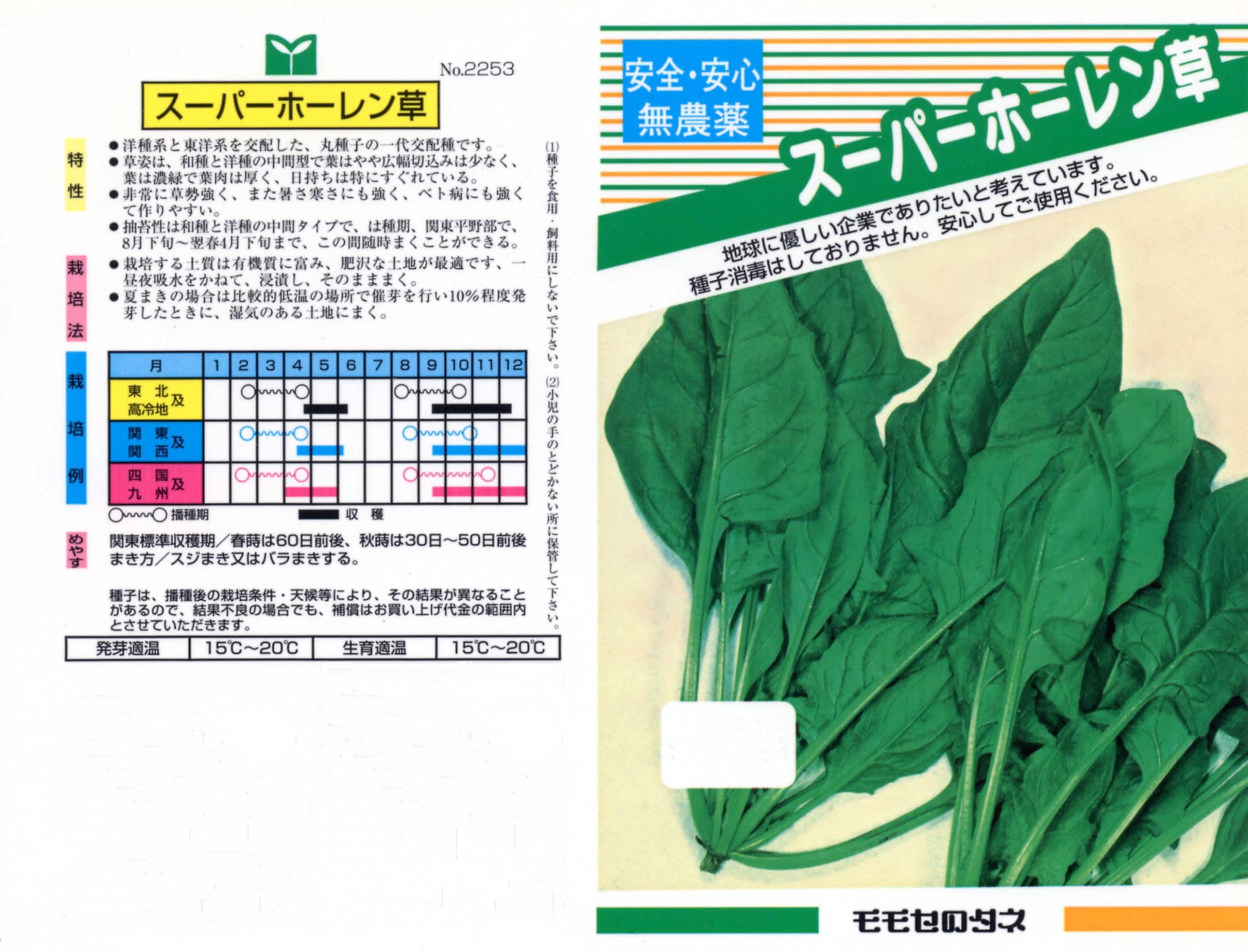 無農薬種子(葉物野菜) 写真をクリックすると拡大します 【商品№】 2253【内容量】 20㎖【税込価格】¥330 スーパーホーレン草 作りやすいホーレン草 西洋系の一代交配種で、初心者でも比較的作りやすいように改良された品種です。強健で、寒さや病気に強く、春まきもできますが秋まきでその力を発揮します。クセが少なく、アクも少ないため食味も上々です。畑はもちろん鉢やプランターでも栽培を楽しむことができます。 【栽培のポイント】 種は一晩水につけてからまきます。畑で作る場合は石灰で酸度矯正を行って下さい。容器栽培の場合は市販の培養土を使うとよいでしょう。 国産無農薬種子 国産無農薬種子(草花) 無農薬種子(葉物野菜) 無農薬種子(根物野菜) 無農薬種子(実物野菜) 楽しい野菜・珍しい野菜 郷土の野菜・伝統野菜 中国野菜 ハーブ 緑のカーテン スプラウト種子 ベビーリーフ種子 昭和の野菜