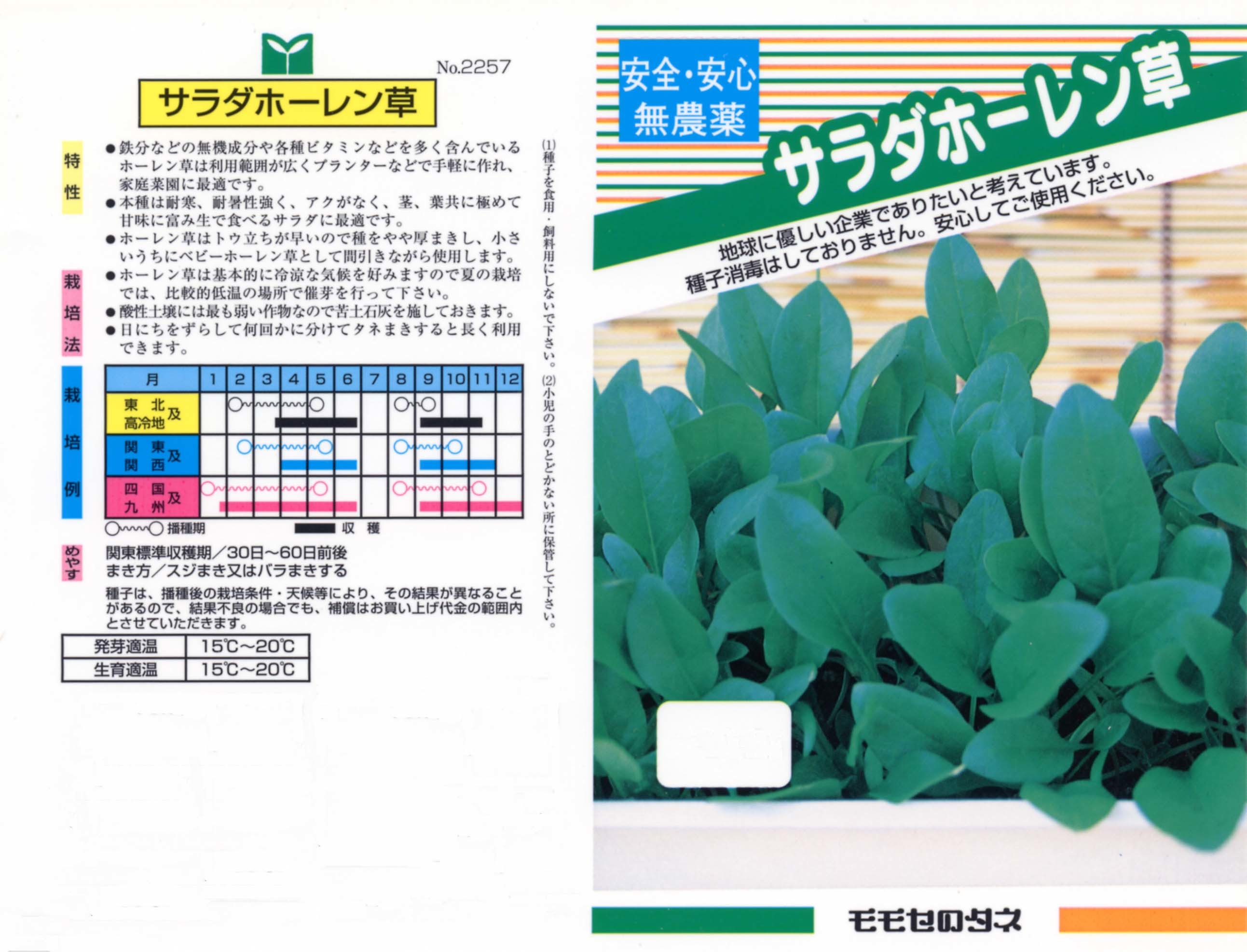 無農薬種子(葉物野菜) 写真をクリックすると拡大します 【商品№】 2257【内容量】 20㎖【税込価格】¥330 サラダホーレン草 生でも食べられる優良種 サラダなどで生食できるように改良されたホーレン草です。アクやクセが少なく違和感なしに生で食べられます。生育期間も短く、鉢やプランターで手軽に栽培できるので、種をずらしまきしておけば順次必要な時に使えて便利です。 【栽培のポイント】 種は一晩水につけてからまきます。容器栽培の場合は市販の培養土を使うとよいでしょう。基本的に小株のうちに利用します。あまり大株にするとアクが出てくる場合があります。 国産無農薬種子 国産無農薬種子(草花) 無農薬種子(葉物野菜) 無農薬種子(根物野菜) 無農薬種子(実物野菜) 楽しい野菜・珍しい野菜 郷土の野菜・伝統野菜 中国野菜 ハーブ 緑のカーテン スプラウト種子 ベビーリーフ種子 昭和の野菜