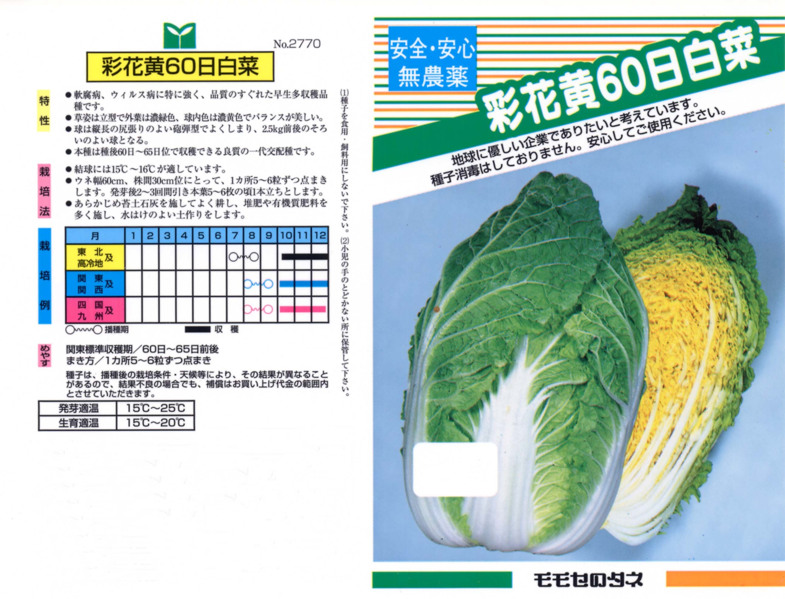 無農薬種子(葉物野菜) 写真をクリックすると拡大します 【商品№】 2770【内容量】 5㎖【税込価格】¥440 彩花黄60日白菜 近年人気の黄芯系白菜 耐病性を高めた黄芯系の交配種です。誰もが作りやすくなることを目指して改良されました。外側の葉は濃い緑で、中の葉は鮮やかな黄色をしています。葉質は柔らかく、漬け物、鍋、炒め物等に、何にでも使える万能白菜です。種まきから収穫まで60~65日くらいの早生種です。 【栽培のポイント】 生育初期の管理に力を入れ、気温が低くなってくる前に葉数がより多くなるように努めましょう。 国産無農薬種子 国産無農薬種子(草花) 無農薬種子(葉物野菜) 無農薬種子(根物野菜) 無農薬種子(実物野菜) 楽しい野菜・珍しい野菜 郷土の野菜・伝統野菜 中国野菜 ハーブ 緑のカーテン スプラウト種子 ベビーリーフ種子 昭和の野菜