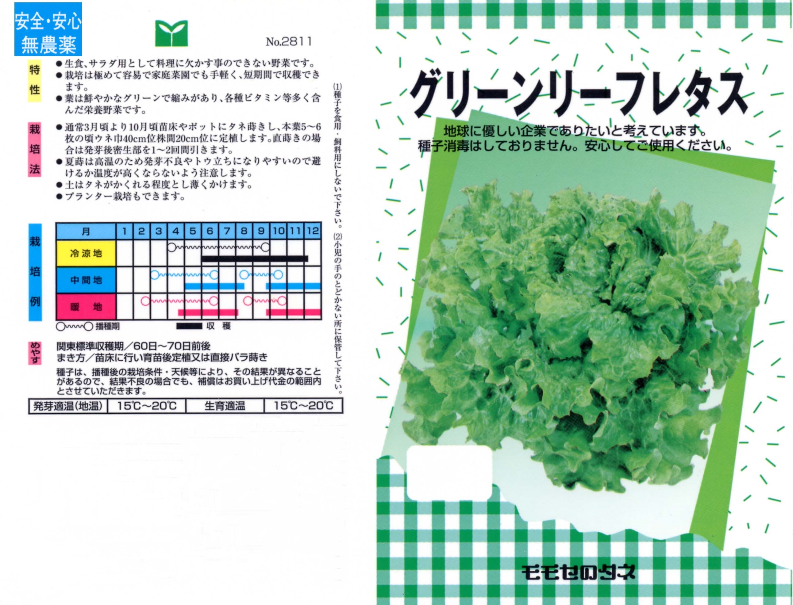 無農薬種子(葉物野菜) 写真をクリックすると拡大します 【商品№】 2811【内容量】 3㎖【税込価格】¥330 グリーンリーフレタス 暑さに強い作りやすいリーフレタス サニーレタスと同じ仲間のレタスで、葉が赤くならないタイプです。他のレタスより耐暑性が強く、栽培適応範囲が広いのが特徴で、家庭菜園でも手軽に作れます。細菌性の病気に対しても抵抗性があります。 【栽培のポイント】 低温期は成長が緩慢になりますので、不織布などのベタ掛けを行うとよいでしょう。 国産無農薬種子 国産無農薬種子(草花) 無農薬種子(葉物野菜) 無農薬種子(根物野菜) 無農薬種子(実物野菜) 楽しい野菜・珍しい野菜 郷土の野菜・伝統野菜 中国野菜 ハーブ 緑のカーテン スプラウト種子 ベビーリーフ種子 昭和の野菜