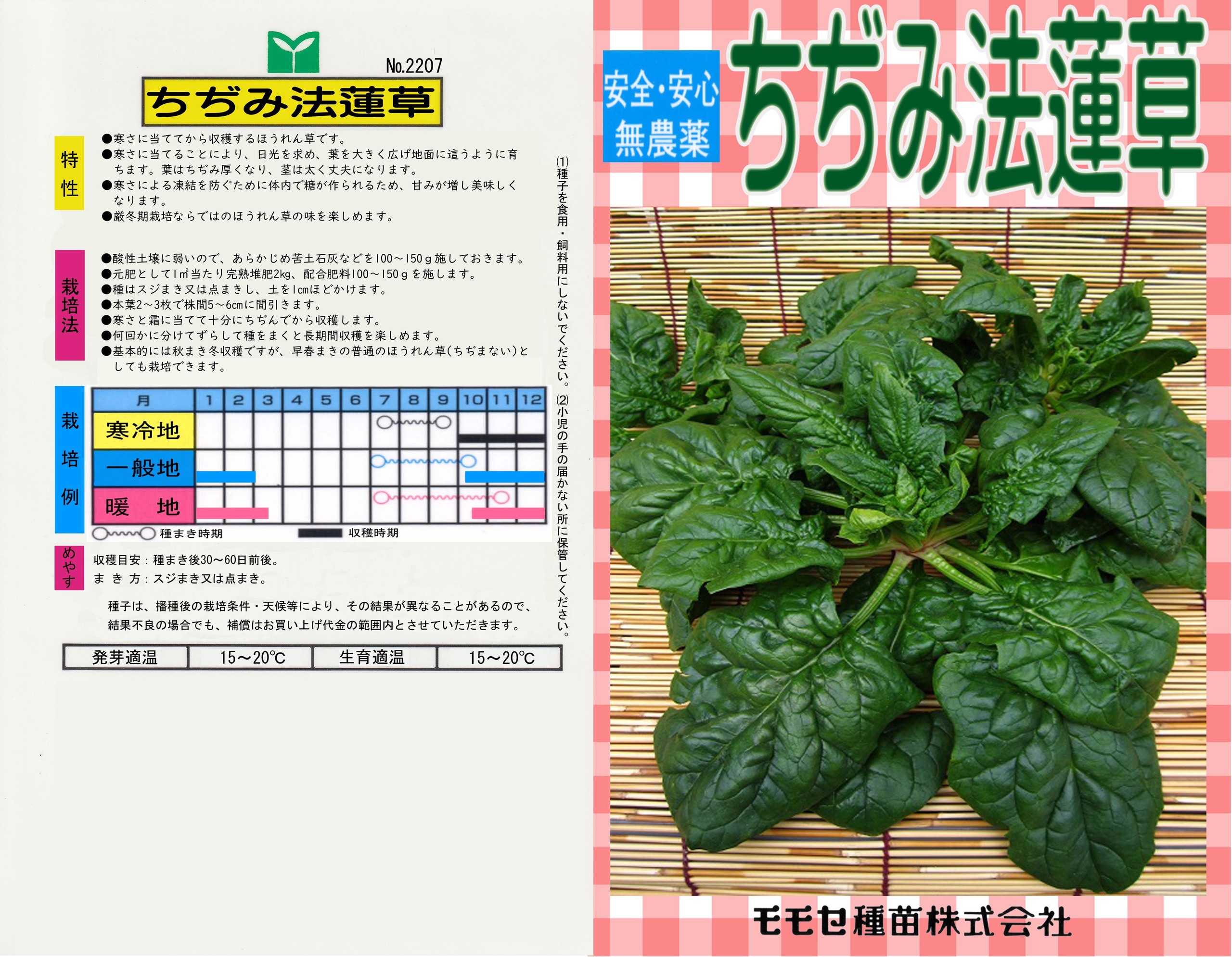 無農薬種子(葉物野菜) 写真をクリックすると拡大します 【商品№】 2207【内容量】 20㎖【税込価格】¥330 ちぢみ法蓮草 真冬の美味しいほうれん草 冬の寒さにあえて合わせることにより、食味をアップさせるほうれん草です。寒さに合うとほうれん草自身が凍結により枯死するのを防ぐため、体内で糖分を生成するため、通常のほうれん草よりも甘く美味しくなります。見た目はややごつく悪くなりますが、味は絶品です。真冬の味覚としてぜひお試しください。 【栽培のポイント】 酸性土に弱いので栽培地にはあらかじめ石灰を施しておきましょう。 必ず寒さや霜に合わせ、葉がちぢんでから収穫してください。 国産無農薬種子 国産無農薬種子(草花) 無農薬種子(葉物野菜) 無農薬種子(根物野菜) 無農薬種子(実物野菜) 楽しい野菜・珍しい野菜 郷土の野菜・伝統野菜 中国野菜 ハーブ 緑のカーテン スプラウト種子 ベビーリーフ種子 昭和の野菜