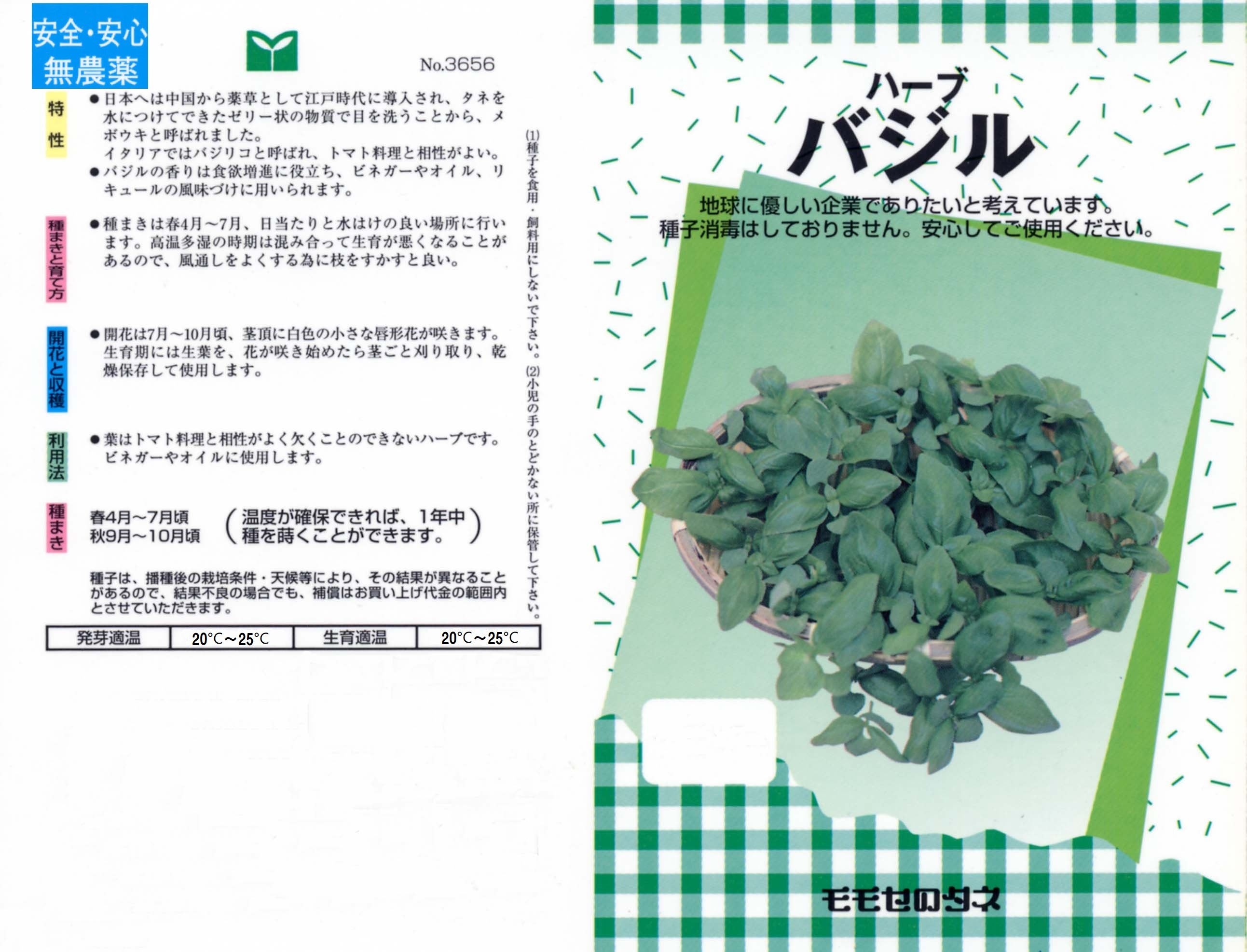無農薬種子(葉物野菜) 写真をクリックすると拡大します 【商品№】 3656【内容量】 1㎖【税込価格】¥330 バジル ハーブの王様 ハーブ類の中で最も有名なバジルは、インドや熱帯アジア原産のシソ科の一年草です。株全体に甘い香りとほのかな辛味があり、いろいろな料理に利用されています。ビタミンやミネラルが豊富で、香り成分には鎮静作用、食欲増進、抗菌作用があるとされています。 【栽培のポイント】 密植しすぎると風通しが悪くなり、病害虫の発生を招くので注意しましょう。 鉢栽培ではサイズが小さすぎると生育が悪く、下葉から枯れることがあります。 好光性種子ですので、種まき後の土は薄くかけるようにしましょう。 国産無農薬種子 国産無農薬種子(草花) 無農薬種子(葉物野菜) 無農薬種子(根物野菜) 無農薬種子(実物野菜) 楽しい野菜・珍しい野菜 郷土の野菜・伝統野菜 中国野菜 ハーブ 緑のカーテン スプラウト種子 ベビーリーフ種子 昭和の野菜