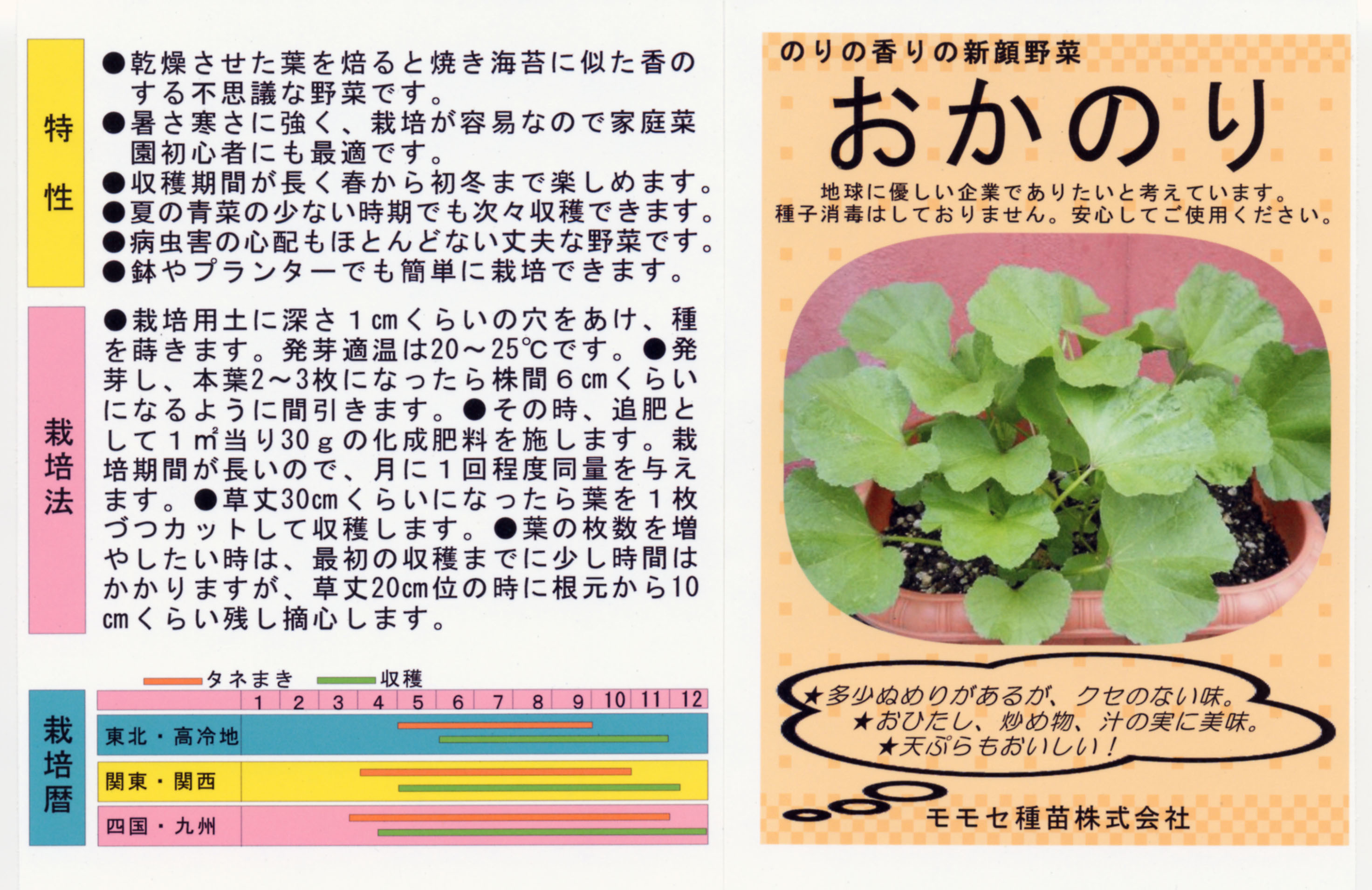 オカノリはアオイ科の一年草で、漢方などで使われる「冬葵」の変種と考えられています。野菜としてはヨーロッパから入ってきたと言われ、乾燥させた葉を火であぶると海苔のような香りがするということで、この名がついたと言われています。オカノリにはビタミン類やカルシウム、鉄分が豊富に含まれていて、代謝を高め、利尿作用やデトックス効果があると言われています。若く柔らかい茎葉を食用とします。茹でてからたたくと粘りが出てきます。お浸しやあえもの、天ぷら、汁の実など、味にクセがないので幅広く利用できます。性質も強健で、春から秋まで長い間収穫できます。
